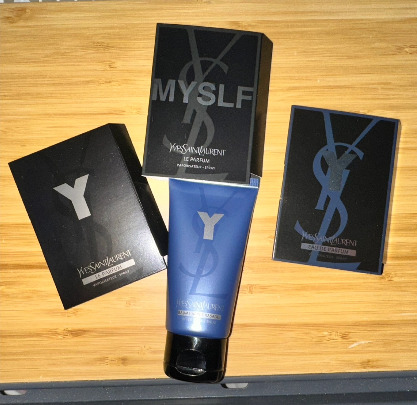 Yves Saint Laurent Y Le Parfum and Myself Le Parfum gift set. Includes three perfume samples and after shave. New, never used.