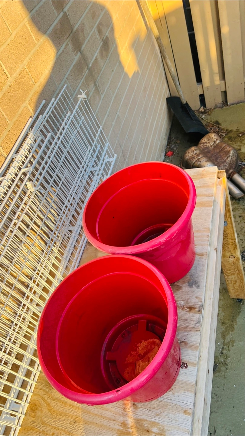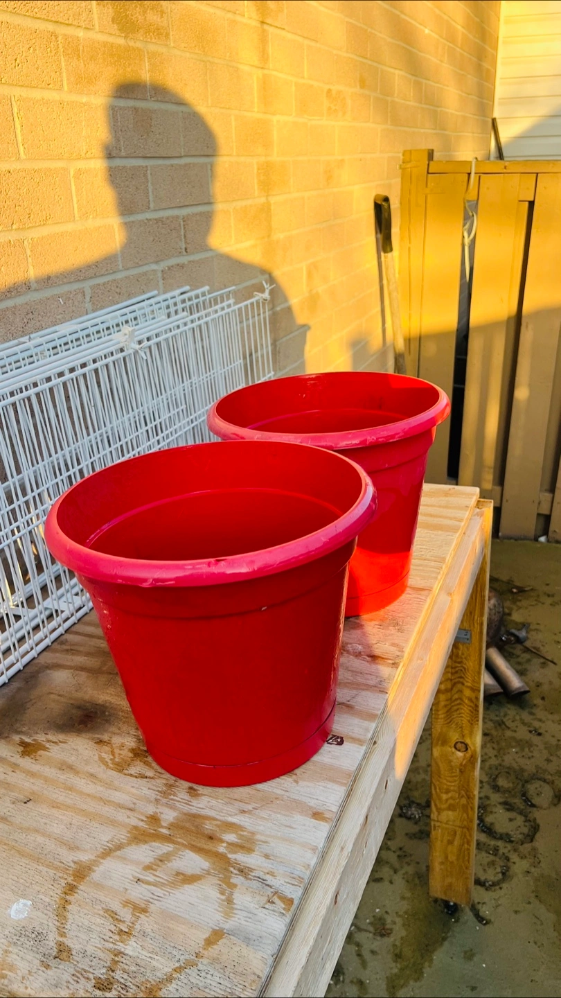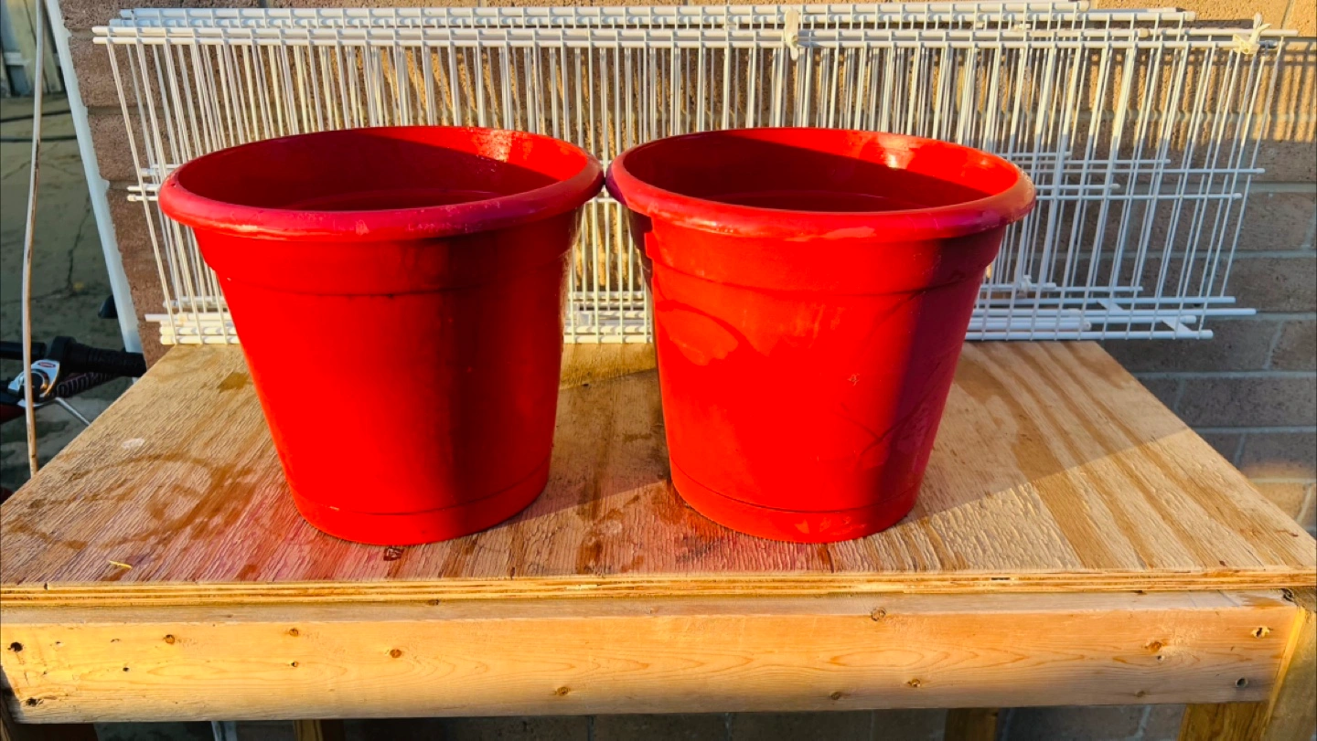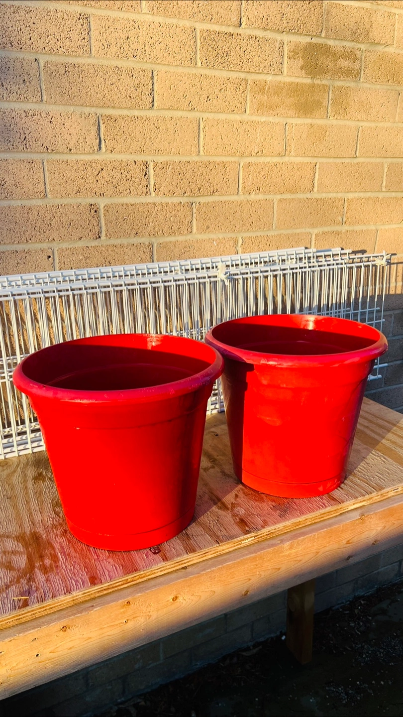 Two large red plastic planters. Good for gardening or decor. Durable and easy to clean.