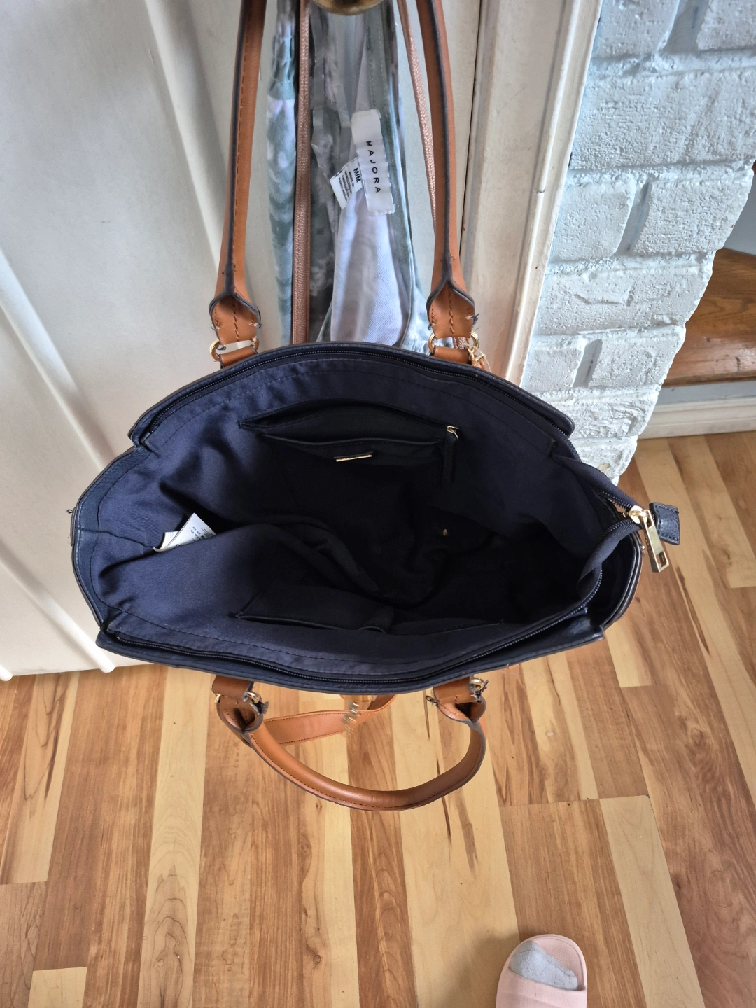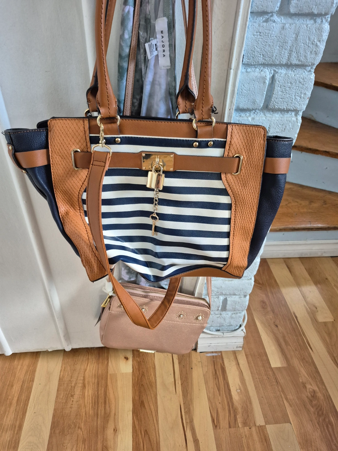 Stylish tote bag, navy, white, and tan stripes. Brown leather-like handles and accents. Gold-toned hardware. Interior zipper pocket. Perfect for everyday use.