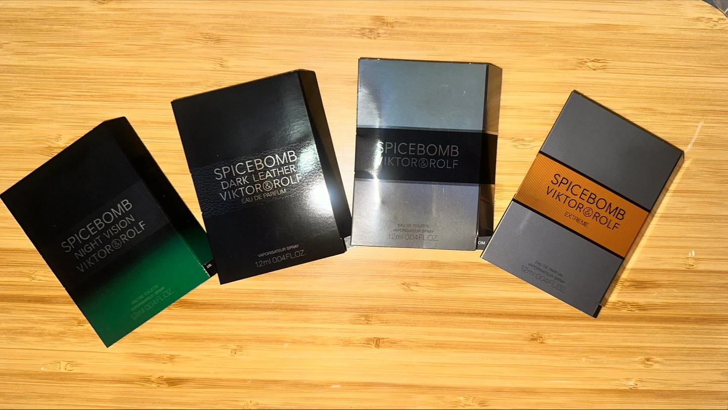Set of four Viktor & Rolf Spicebomb fragrance samples. Includes Spicebomb Dark Leather Eau de Parfum, Spicebomb Extreme Eau de Parfum, Spicebomb Eau de Toilette, and Spicebomb Night Vision Eau de Toilette. Each sample is 1.2ml.