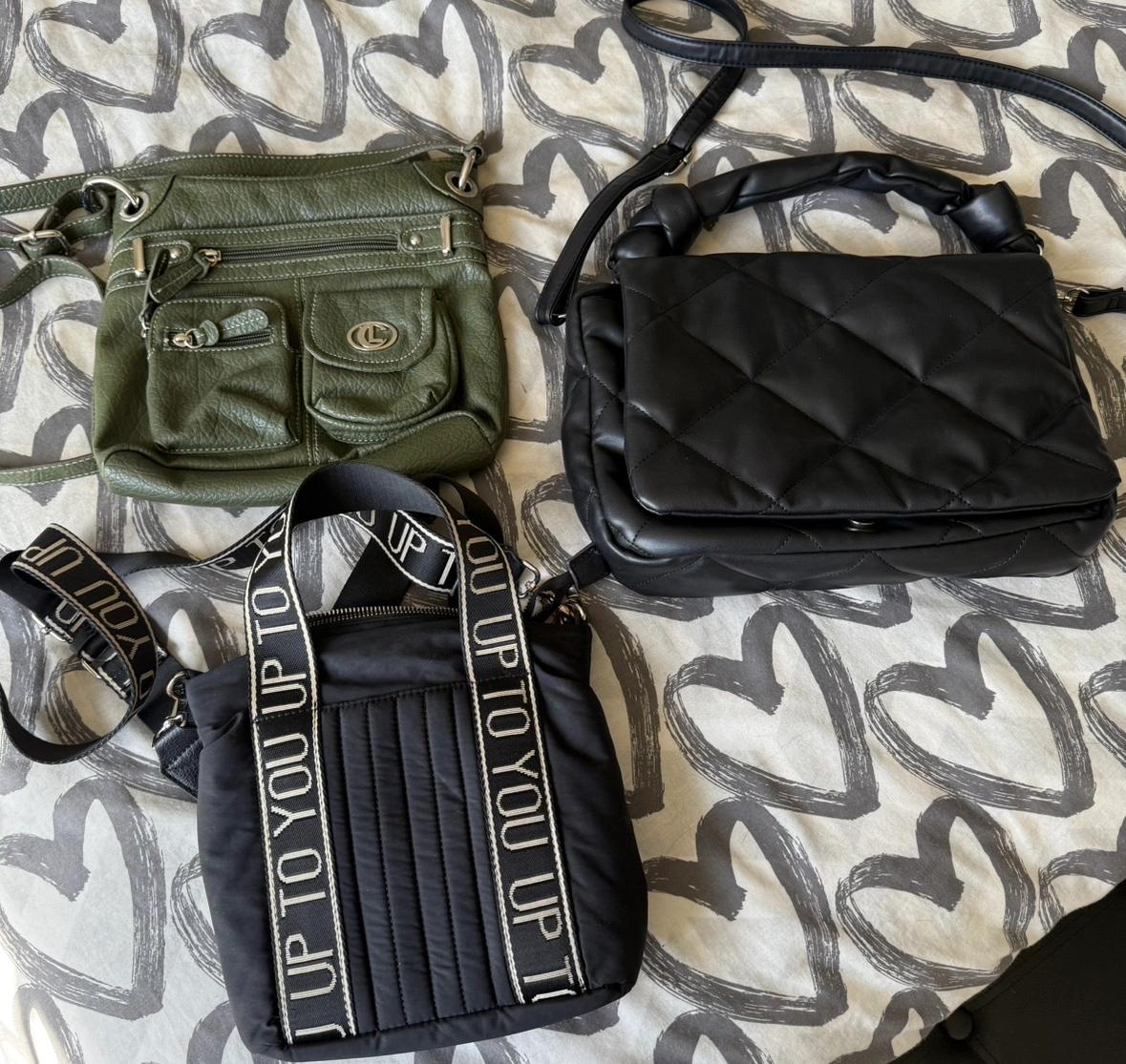 Three stylish crossbody bags. Olive green, black quilted, and black nylon. Great for everyday use or a night out. Pre-owned, good condition.