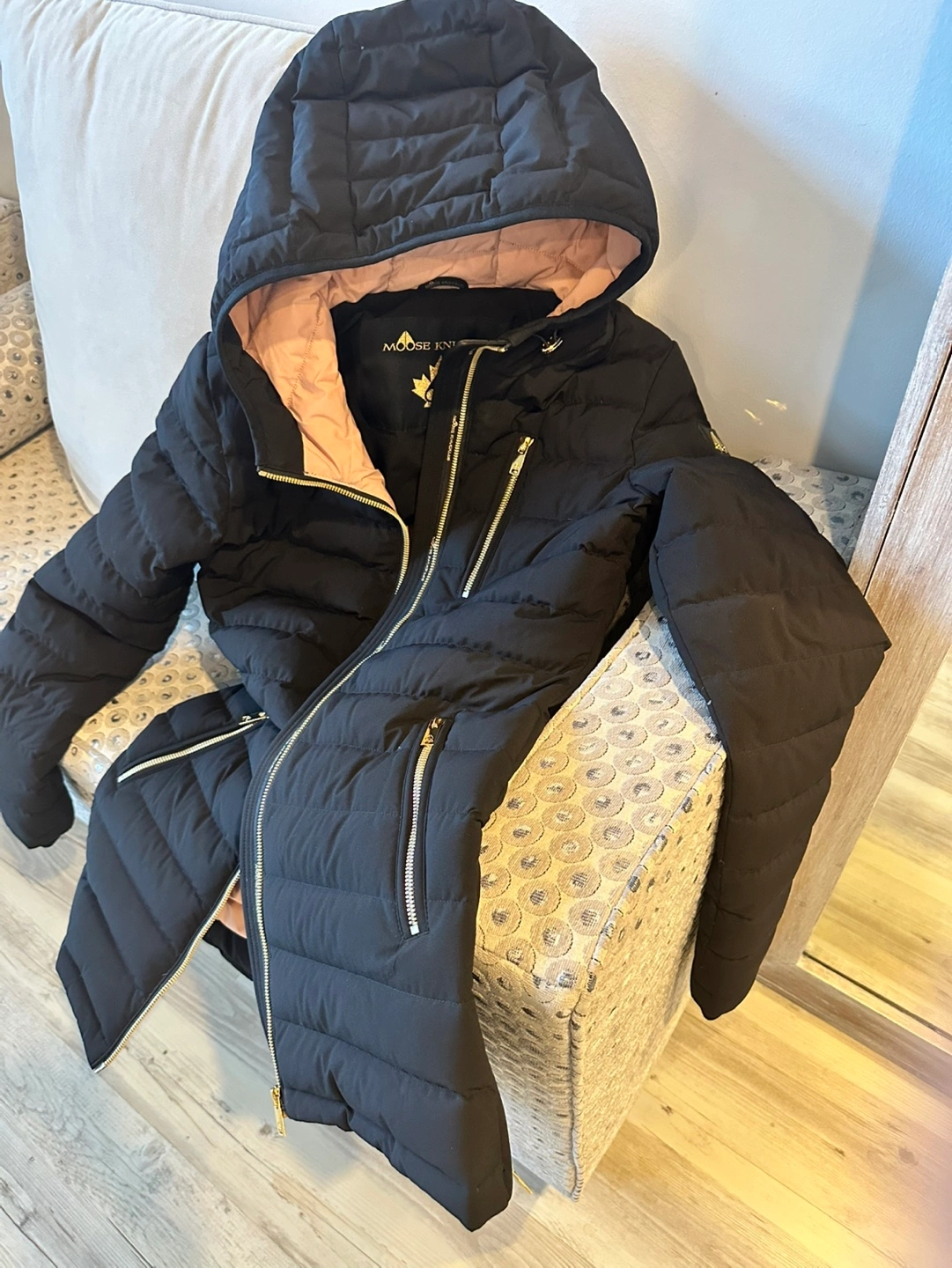 Authentic Women's black light puffer jacket. Size XS/TP. Features a hood and gold zippers. Blush pink interior. Incredibly comfortable and stylish. Excellent condition. Truly like new.