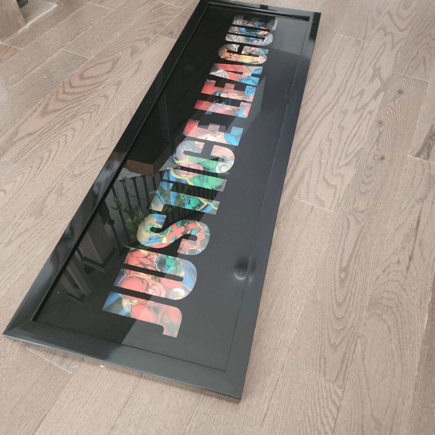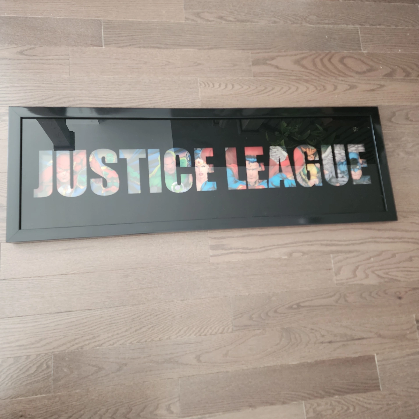 Framed Justice League artwork. Features comic book imagery. Black frame. Long rectangular shape. Great for a fan's room.