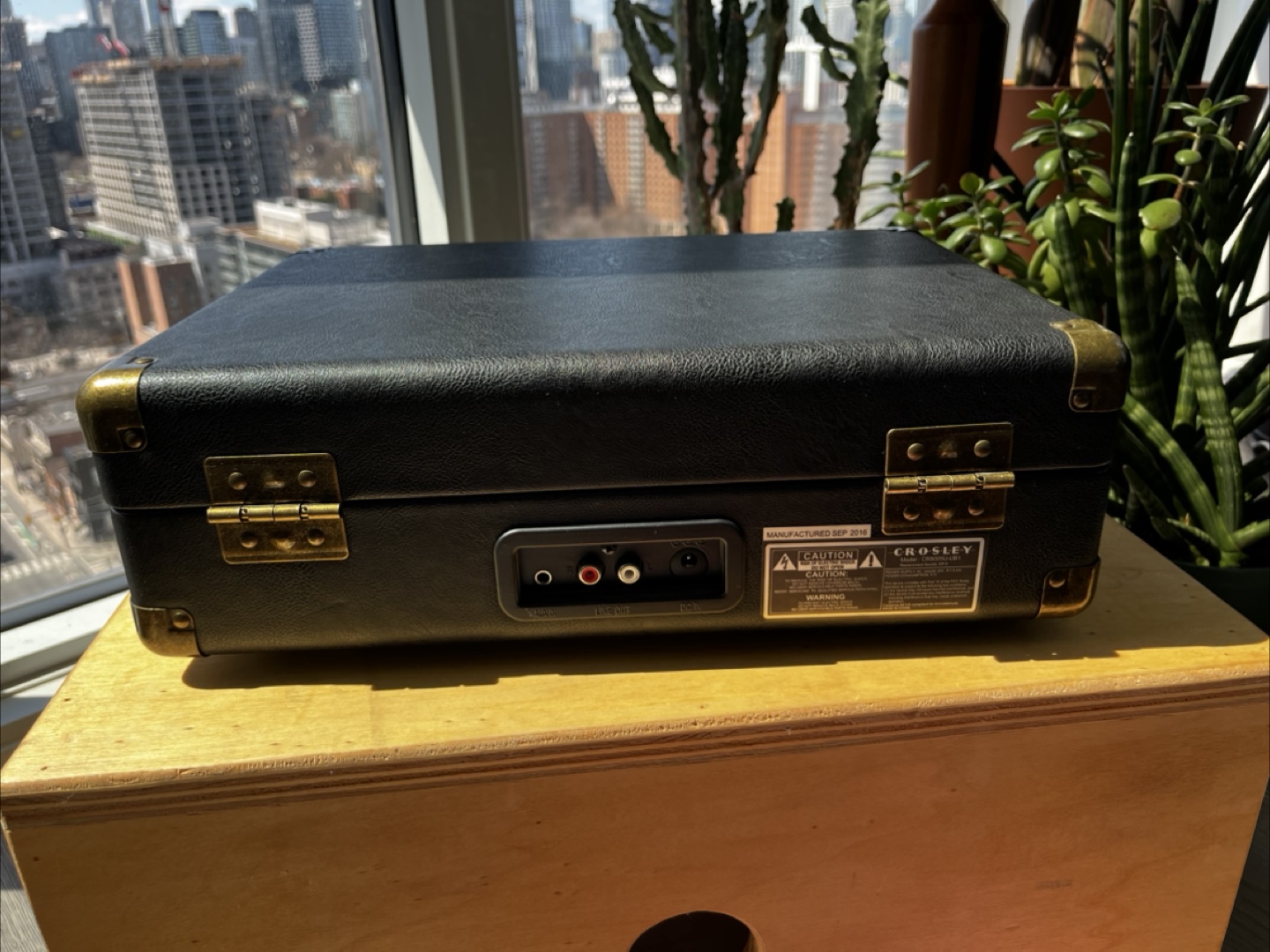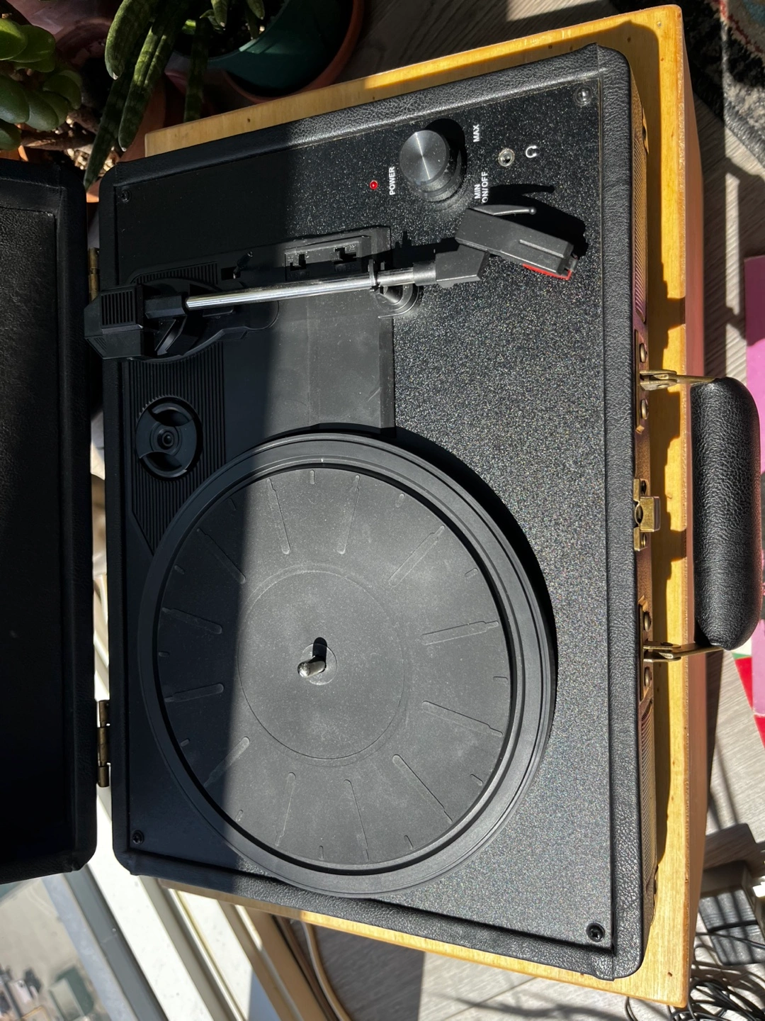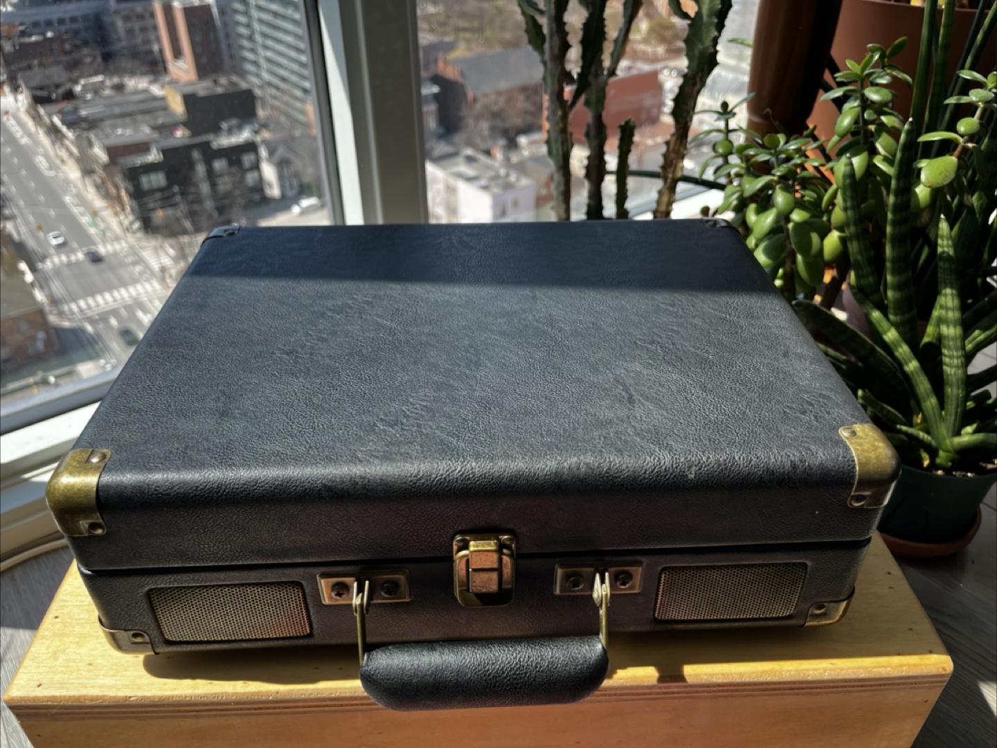 Vintage-style suitcase turntable. Plays 33 1/3, 45, and 78 RPM records. Built-in speakers. Portable design, perfect for travelling. Includes power adapter.