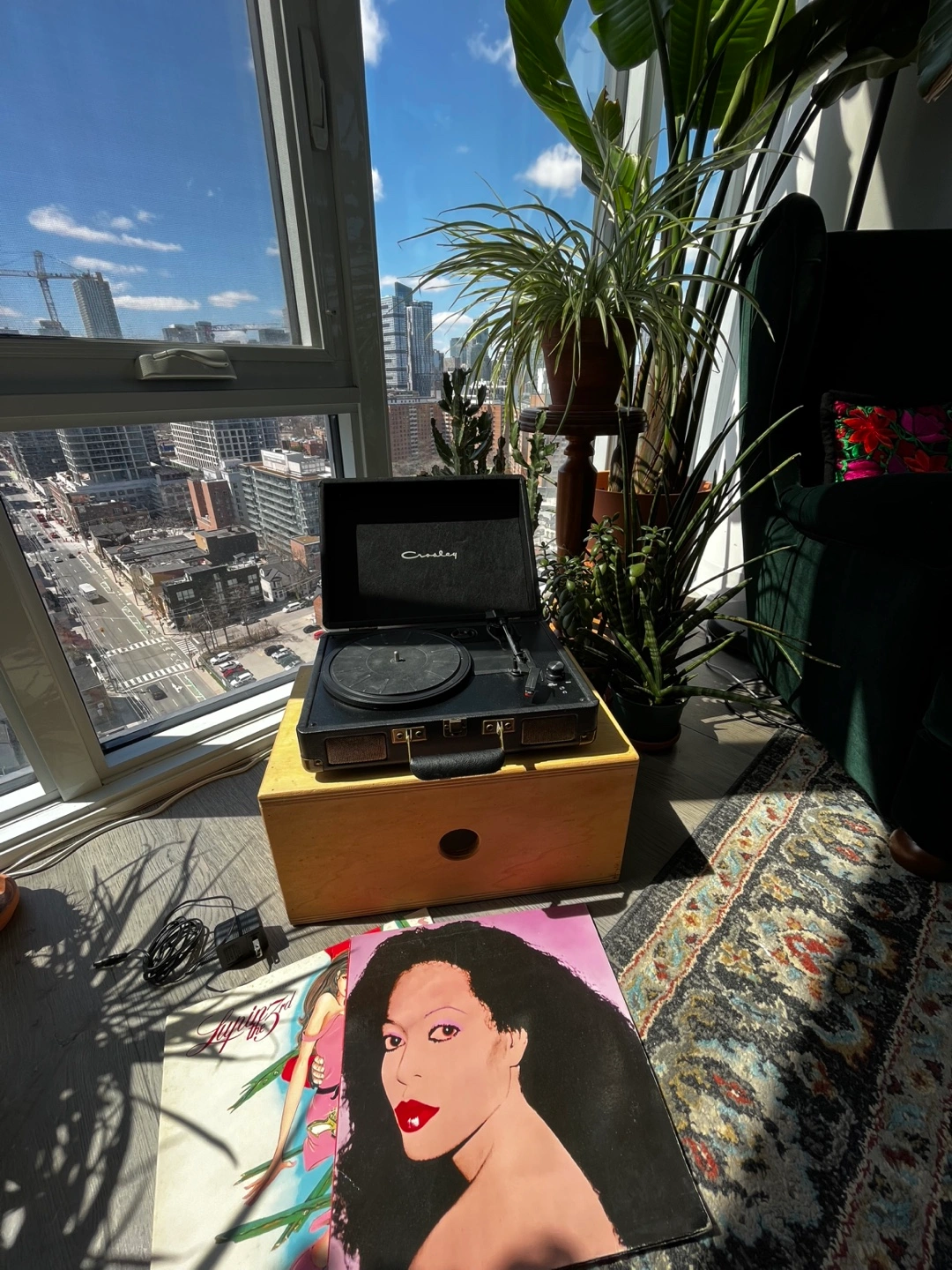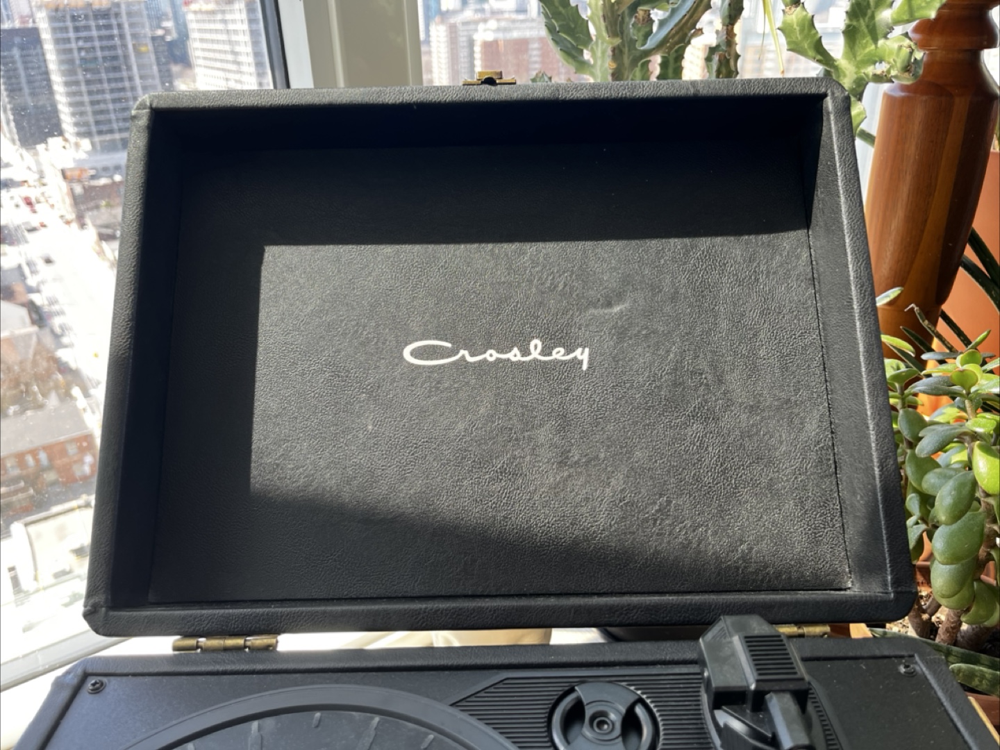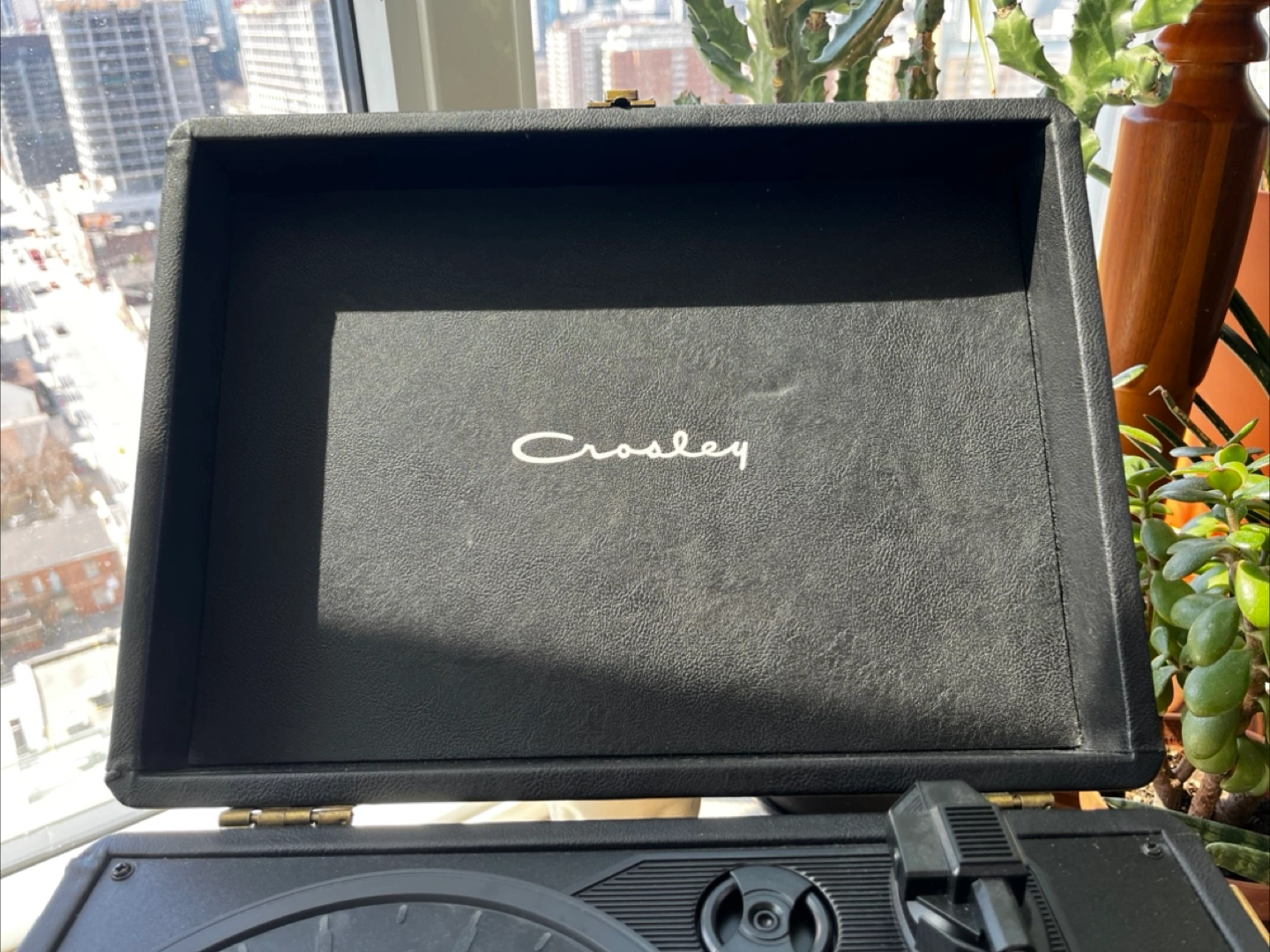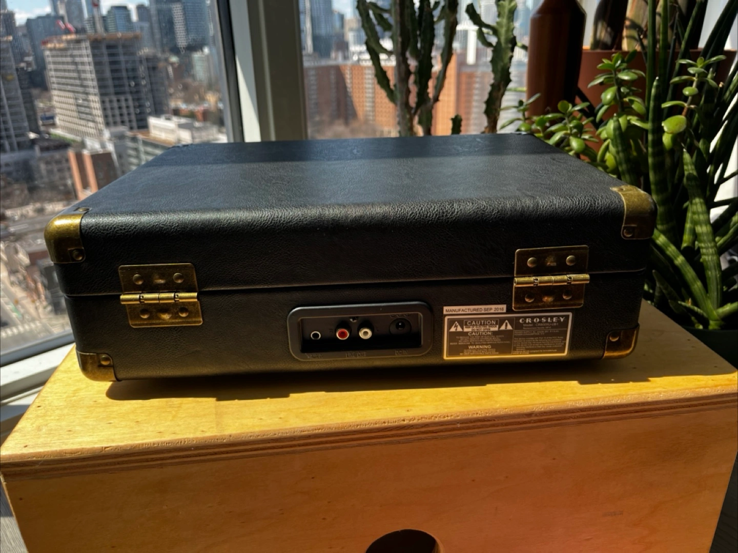Vintage-style suitcase turntable. Plays 33 1/3, 45, and 78 RPM records. Built-in speakers. Portable design, perfect for travelling. Includes power adapter.