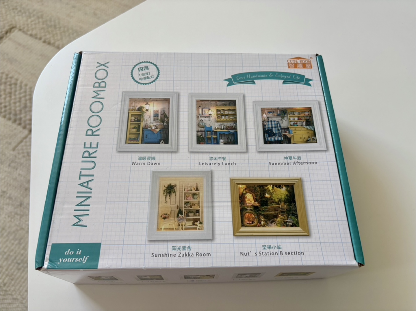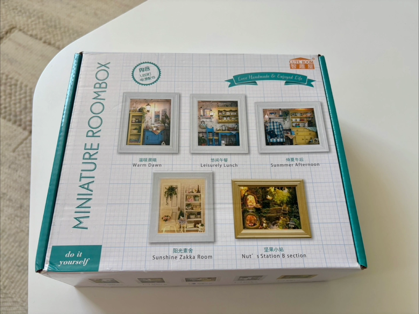 Unassembled miniature roombox kit. Includes all materials to create a charming miniature scene. Perfect for crafting enthusiasts. Easy to assemble. White frames. Free glue.