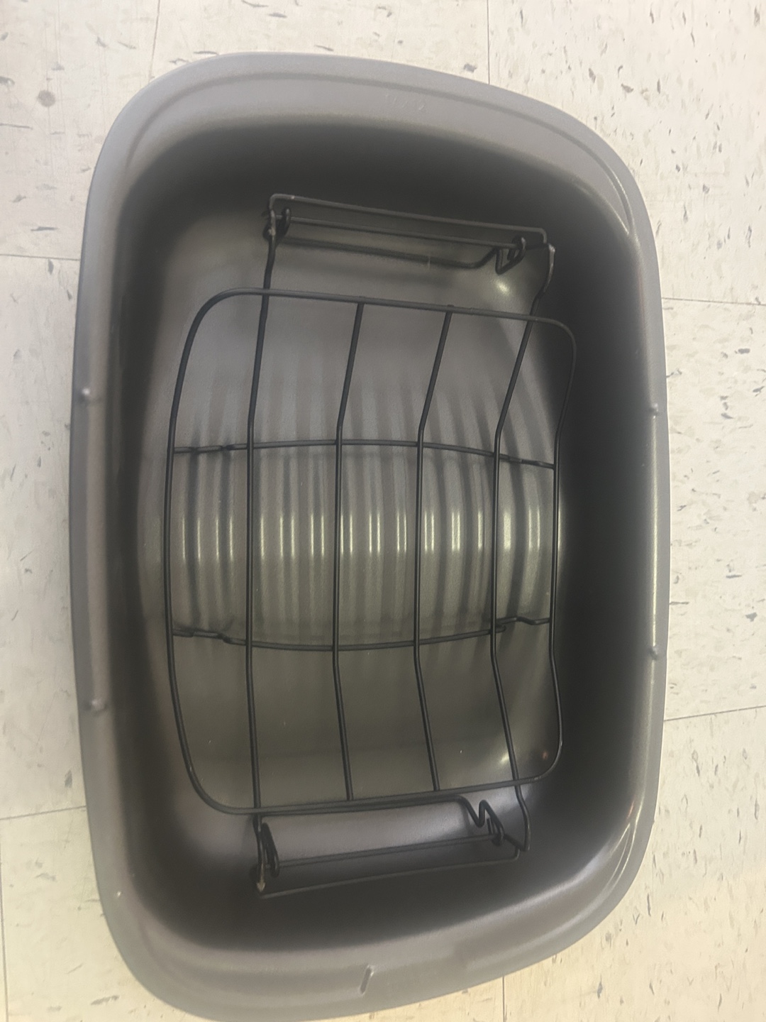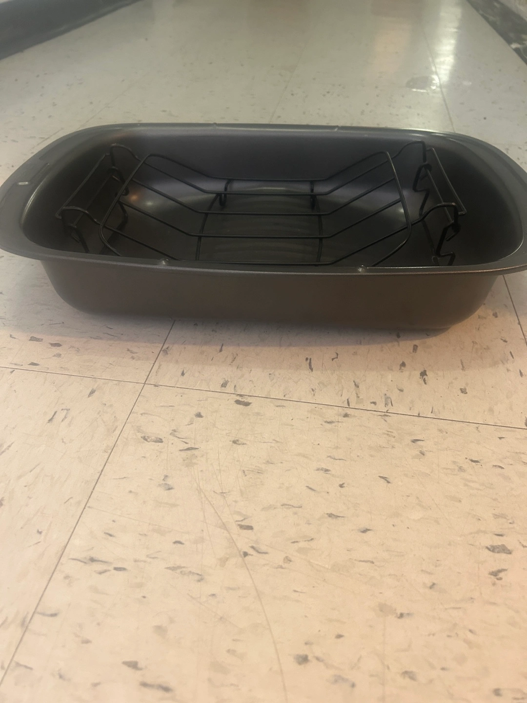 Grey roasting pan. Includes wire rack. Great for roasting chicken or vegetables. Durable and easy to clean. Never used