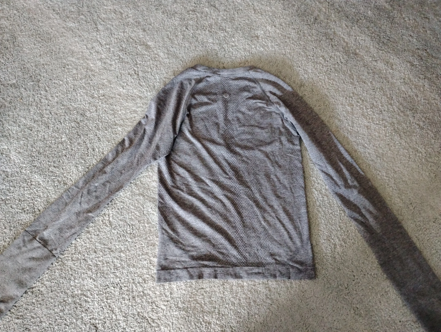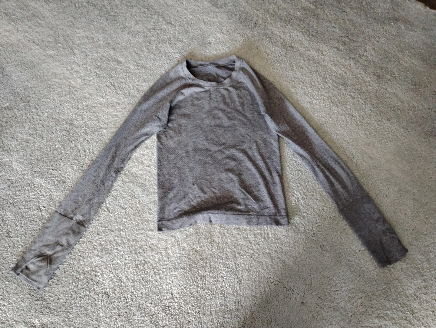 Grey long sleeve athletic shirt. Small size. Features thumbholes. Breathable material. Excellent for workouts.