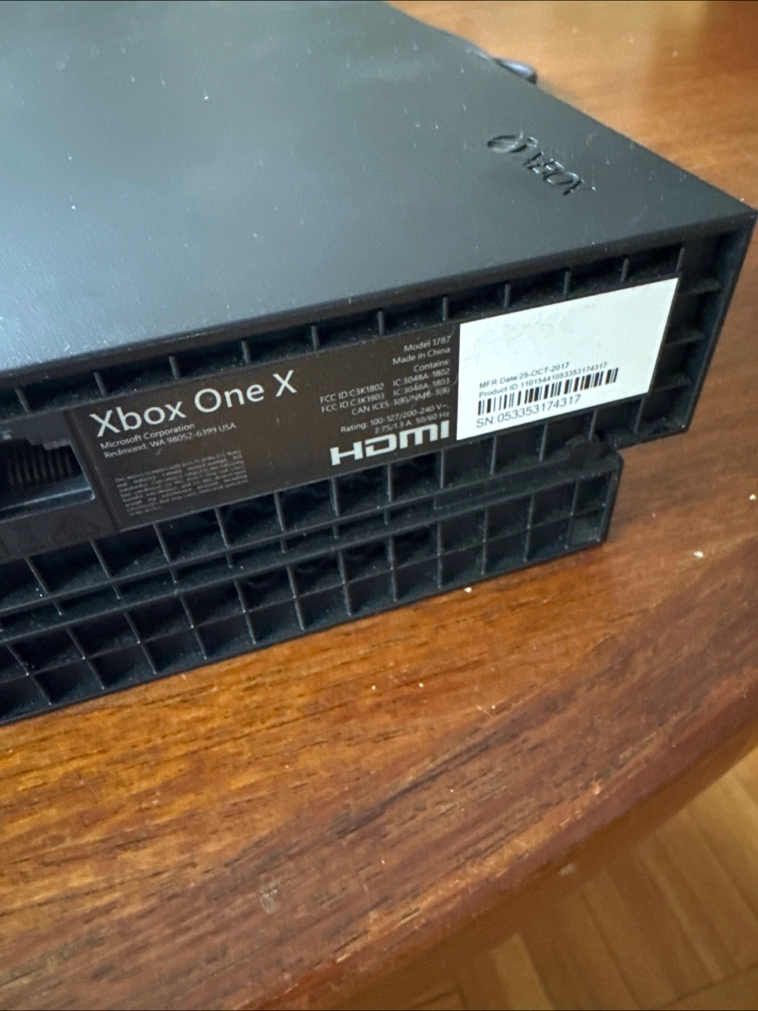 Xbox One X series, 1TB, with wired controller. Tested, works great. The console is in good condition. Controller has normal wear and tear on thumb stick. No HDMI cable.