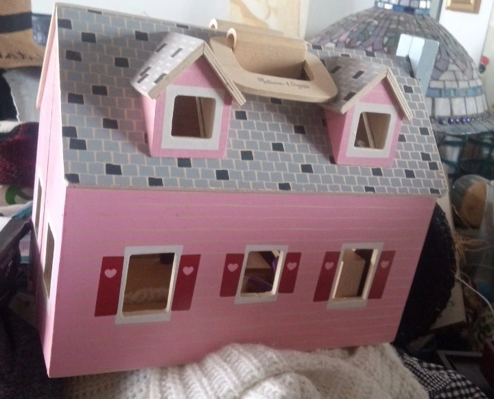 Adorable pink wooden dollhouse. Gray roof. Features multiple rooms and windows. Perfect for imaginative play.