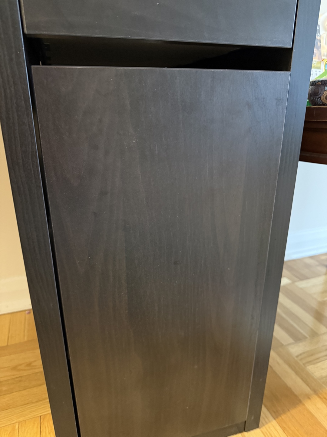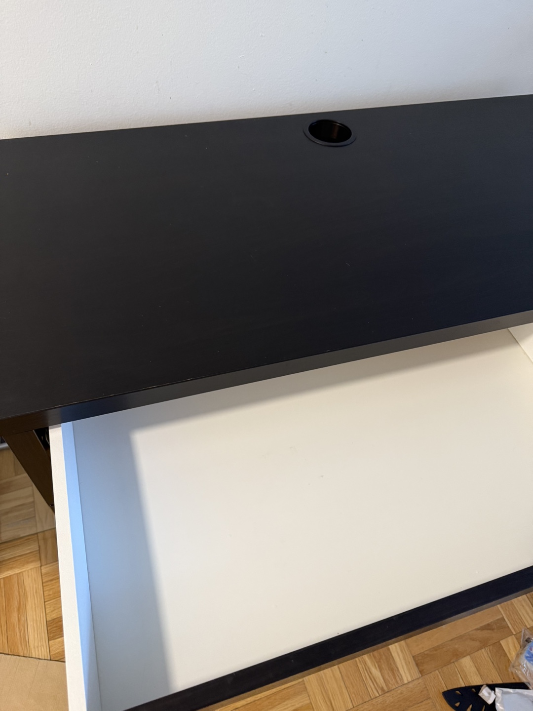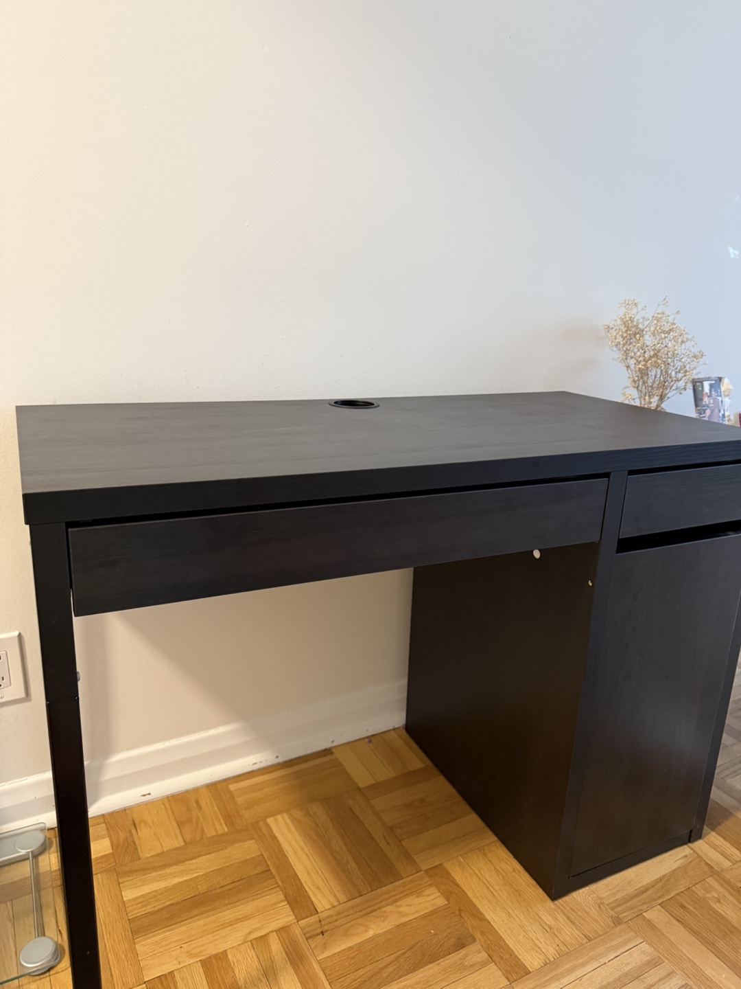 Dark brown desk. One drawer and one cabinet. Cable management hole. Minimalist design. Good condition. Real price $140