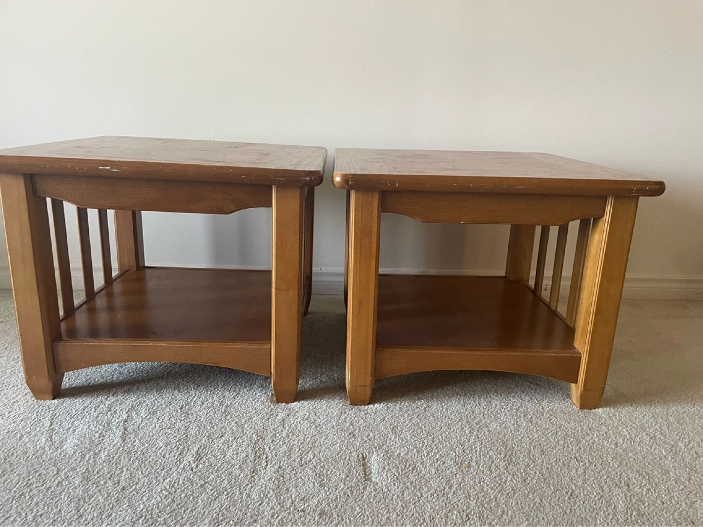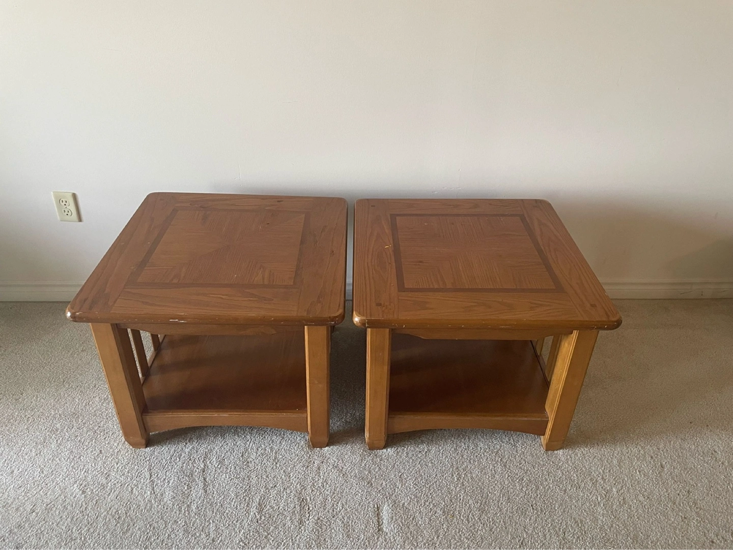 Matching pair of square end tables. Solid wood construction. Simple design. Some minor wear and tear. Can be use as a coffee table. Smoke free and pet free home $25 each $50 for both the side tables