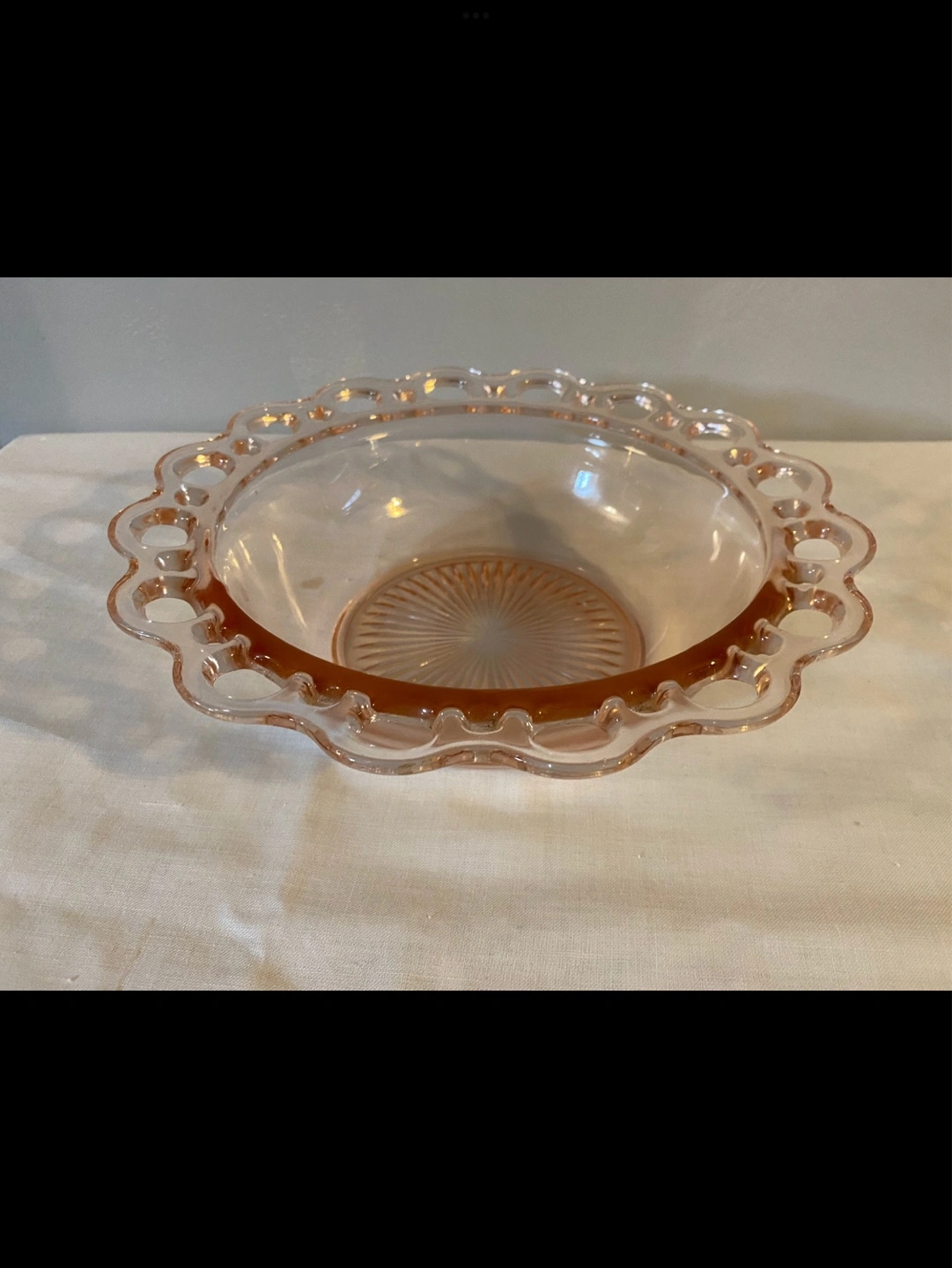 Vintage Pink Depression Glass Bowl: Lace Edge/Open Lace