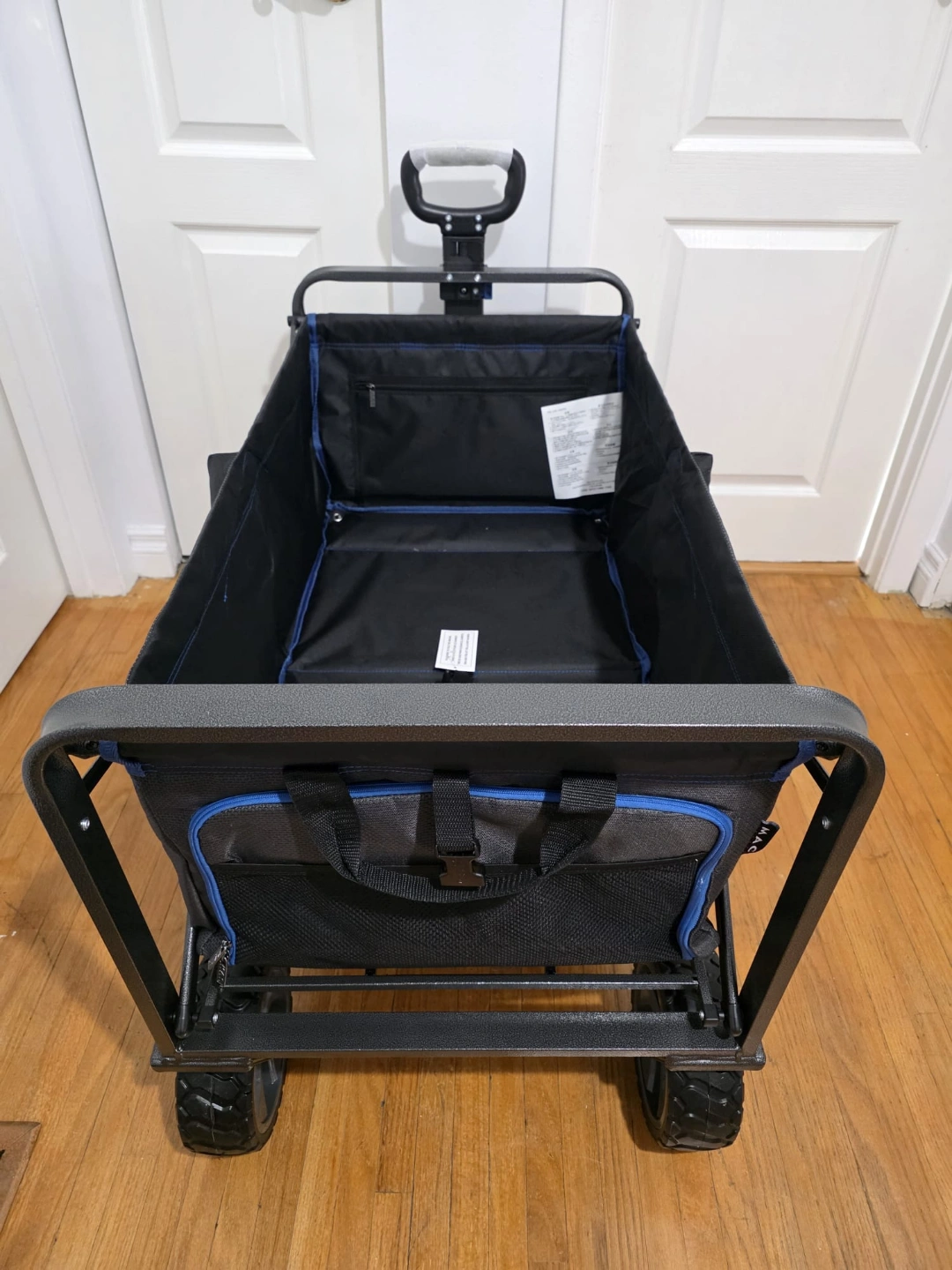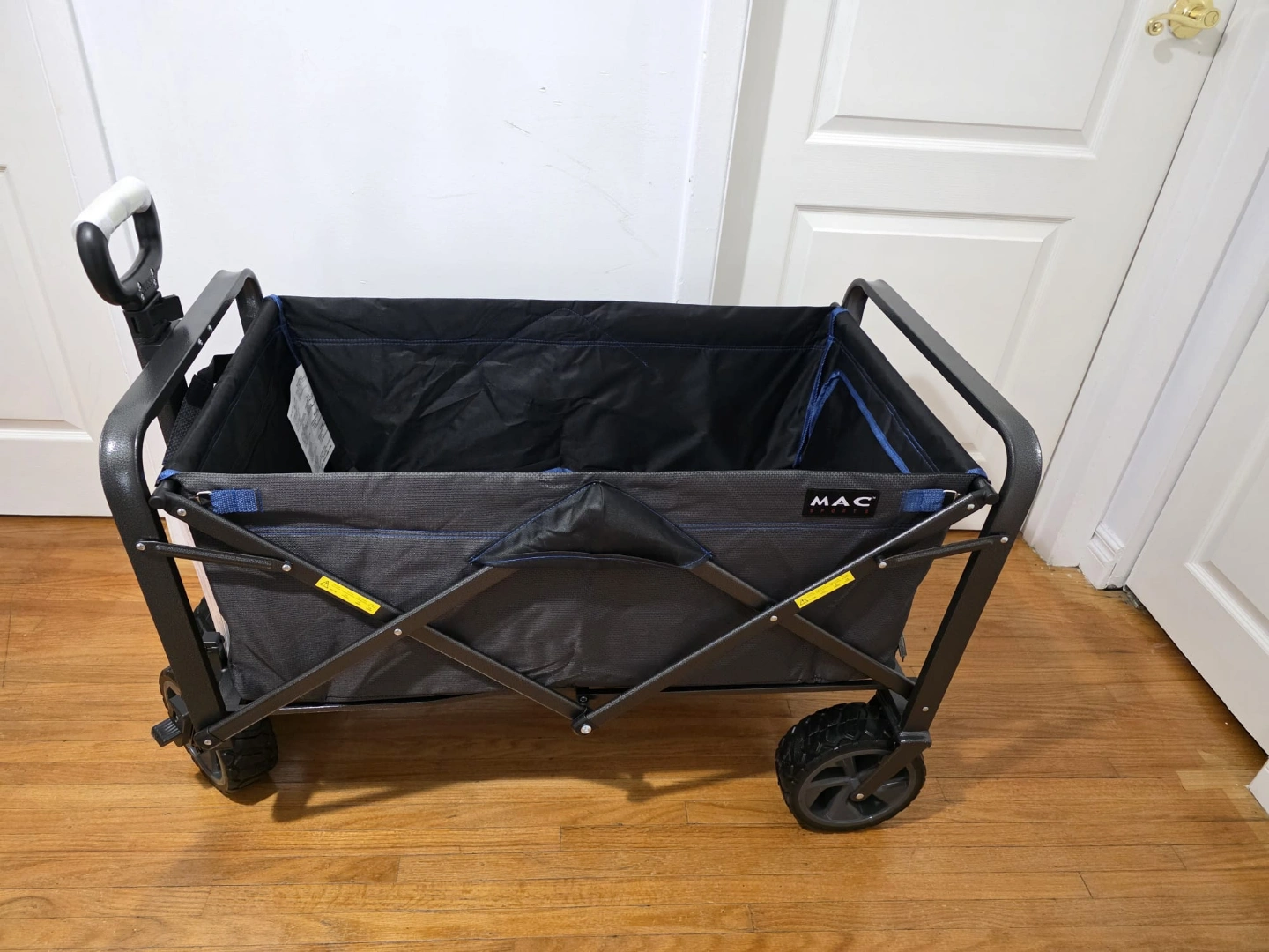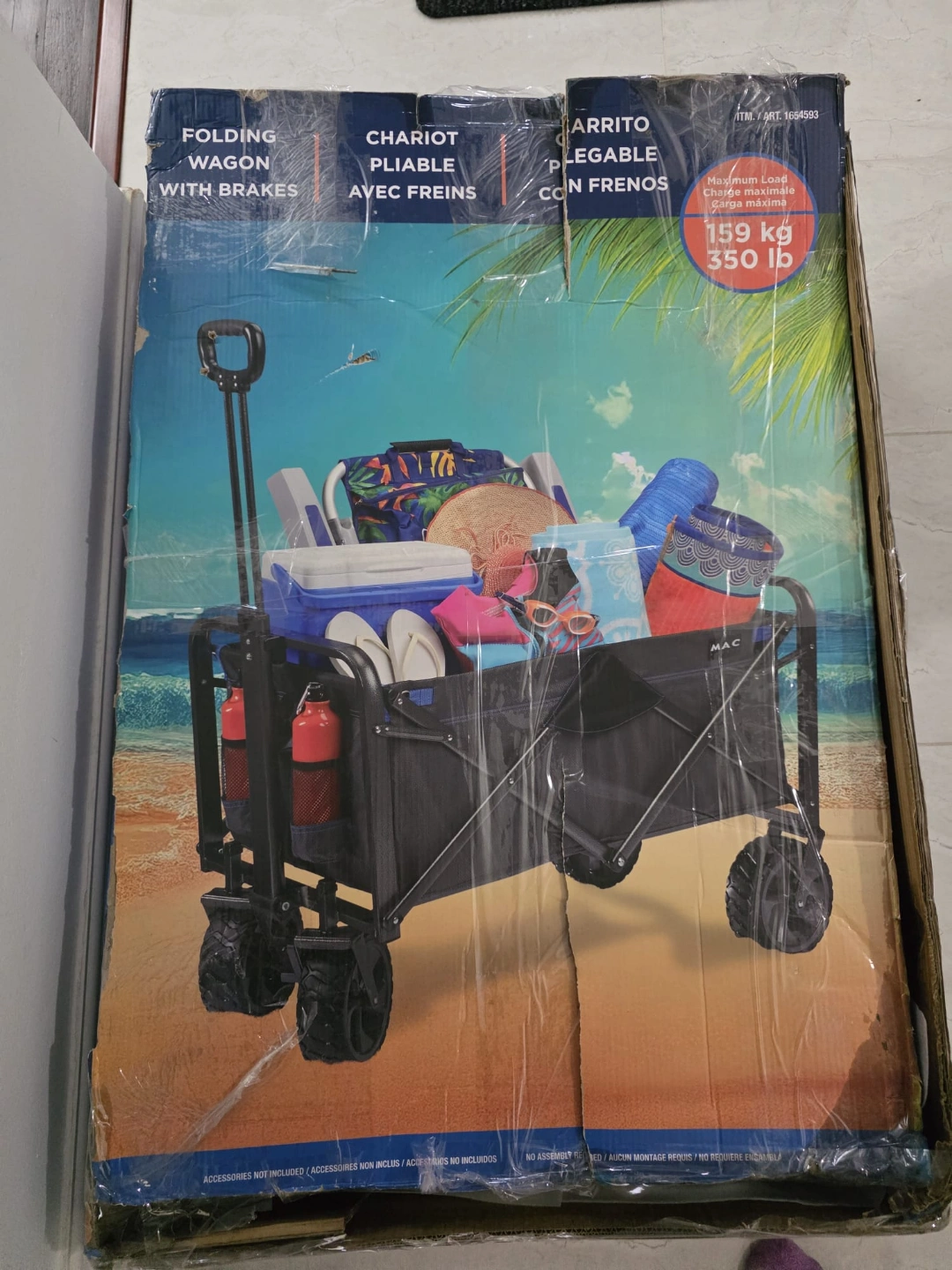 Heavy-duty folding wagon. Features large wheels and a spacious cargo area. Includes multiple pockets for storage. Maximum load 159 kg/350 lbs. Collapses for easy storage.