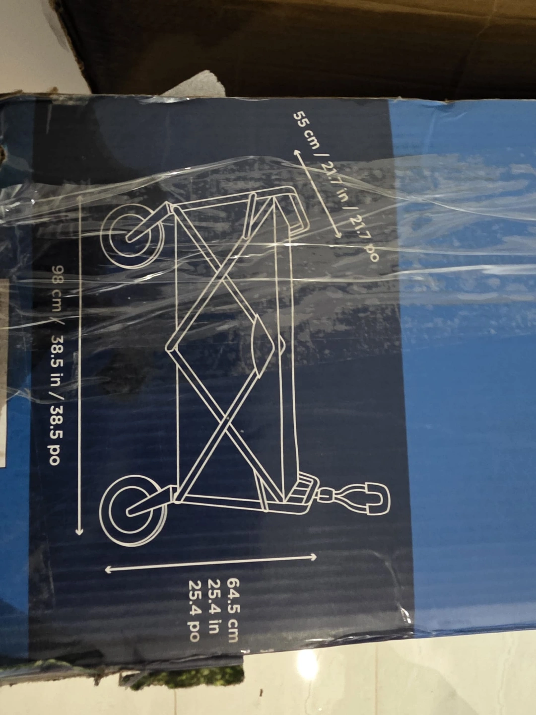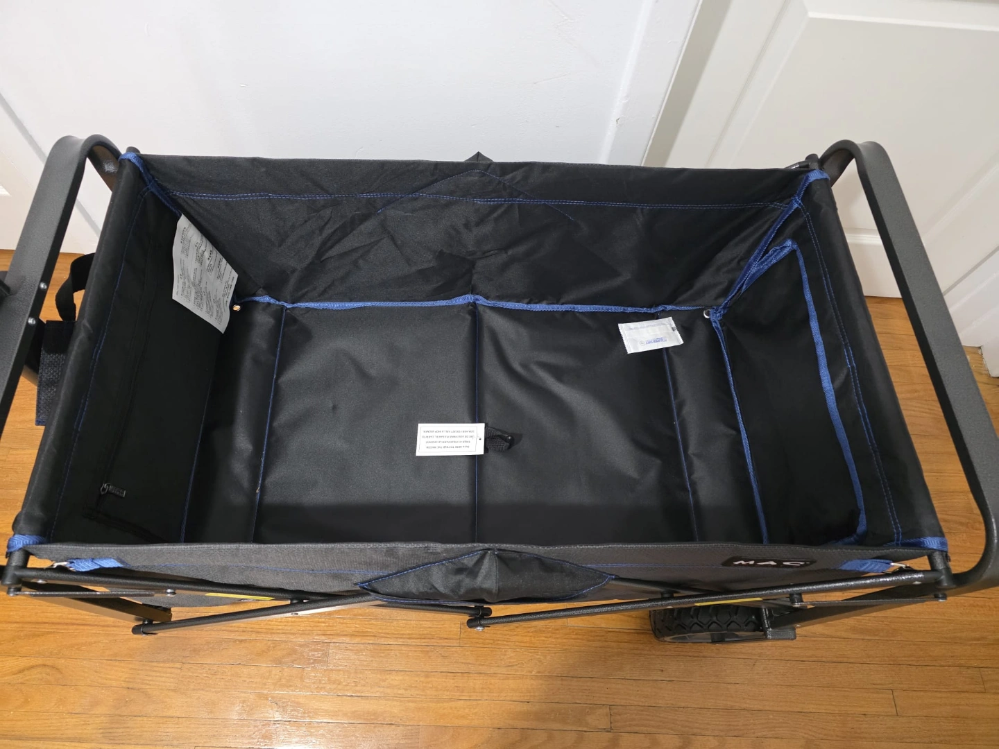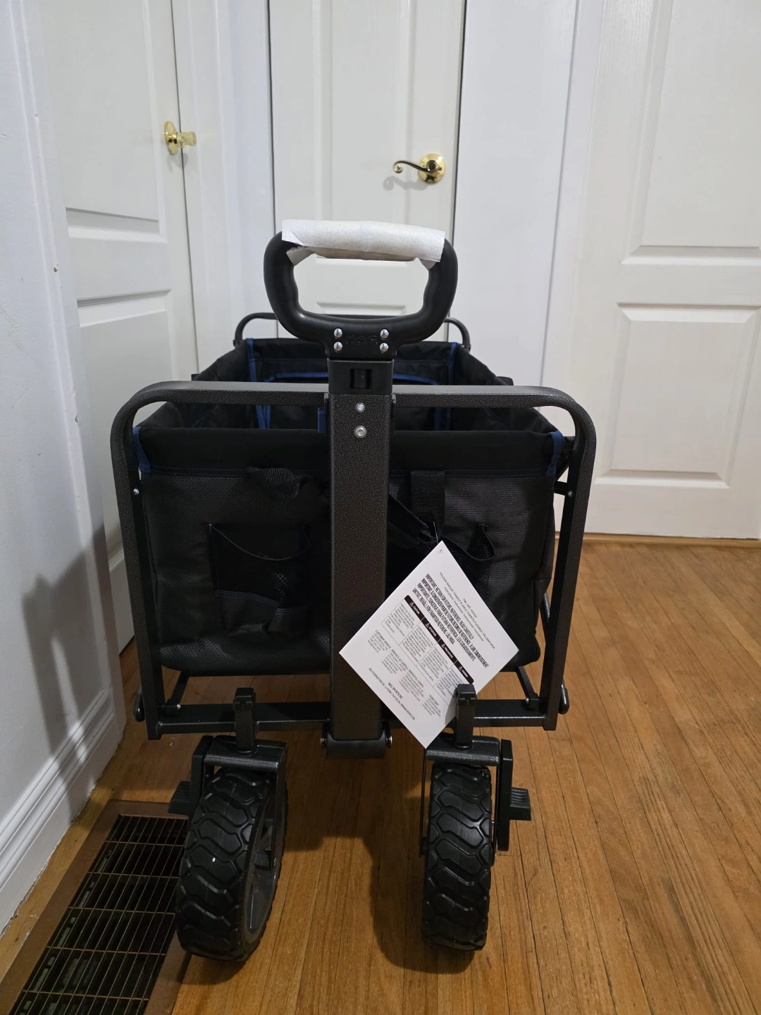 Heavy-duty folding wagon. Features large wheels and a spacious cargo area. Includes multiple pockets for storage. Maximum load 159 kg/350 lbs. Collapses for easy storage.