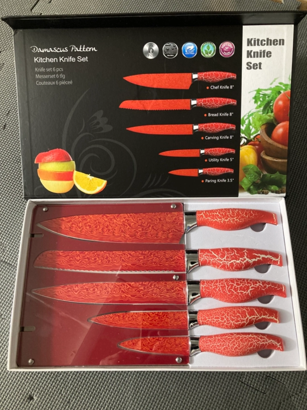 New, never used 6-piece kitchen knife set. Includes chef, bread, carving, utility, and paring knives. Red handles, Damascus pattern blades. Comes in a protective block.