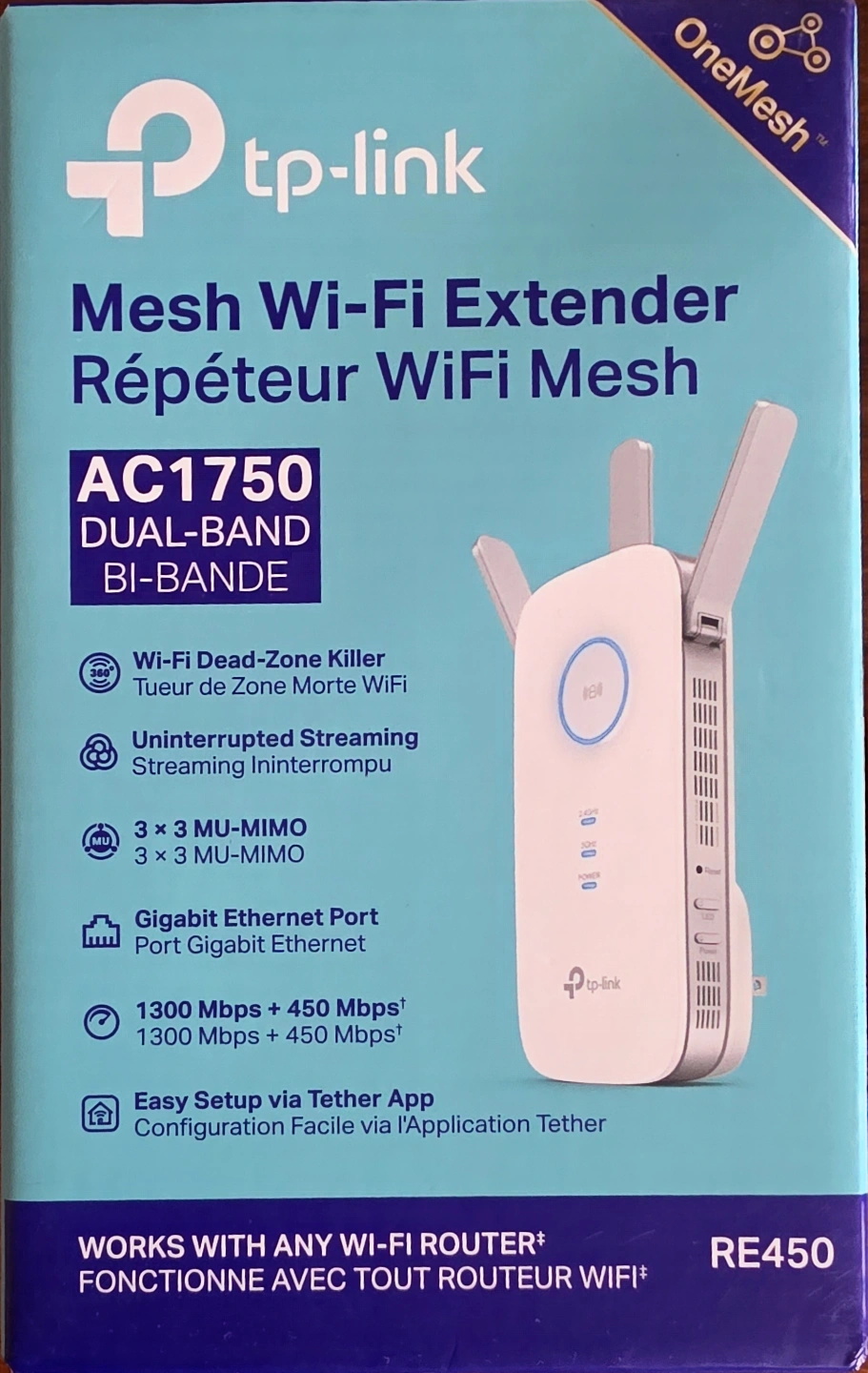 New TP-Link RE450 Mesh Wi-Fi extender. Dual-band AC1750. Gigabit Ethernet port. Easy setup via Tether app. Works with any Wi-Fi router.