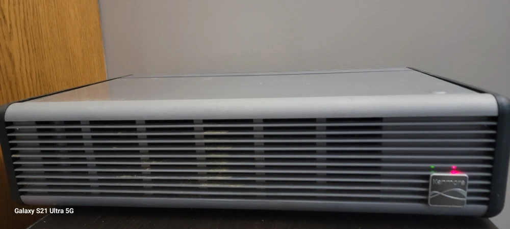 Grey air purifier. Lots of vents. Compact design. Power indicator light.