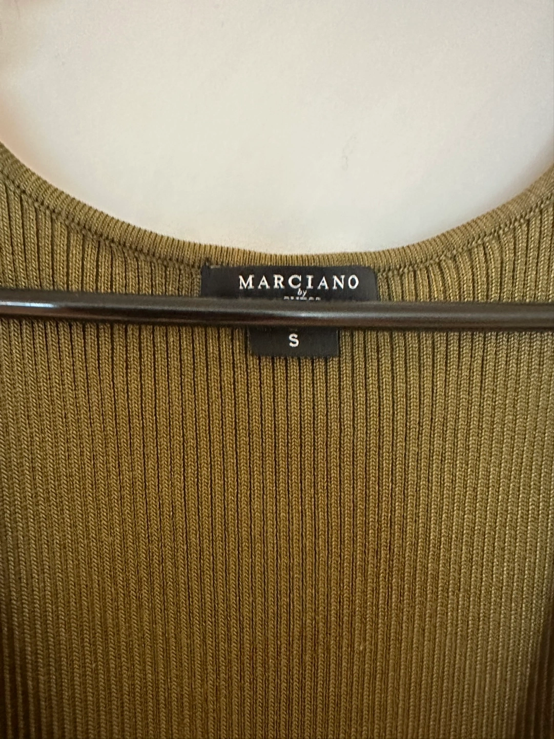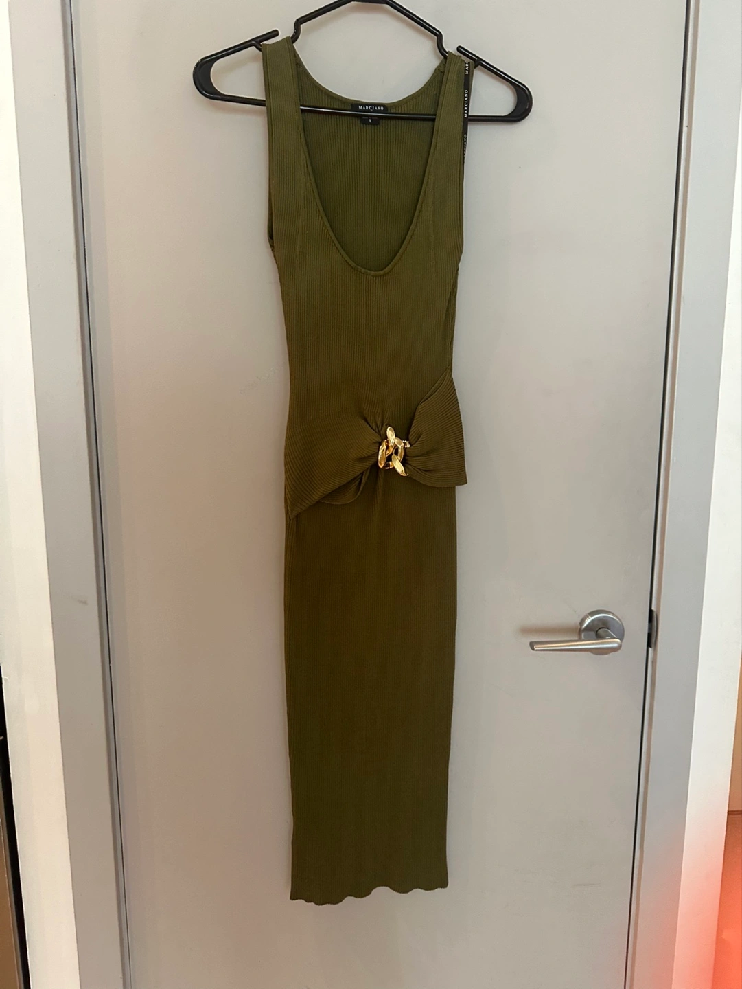Brand new Olive green ribbed midi dress. Size small. Features a unique gold accent at the waist. Sleeveless and form-fitting.