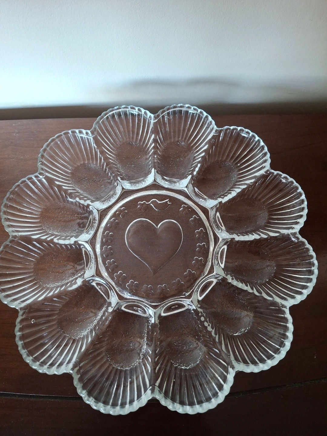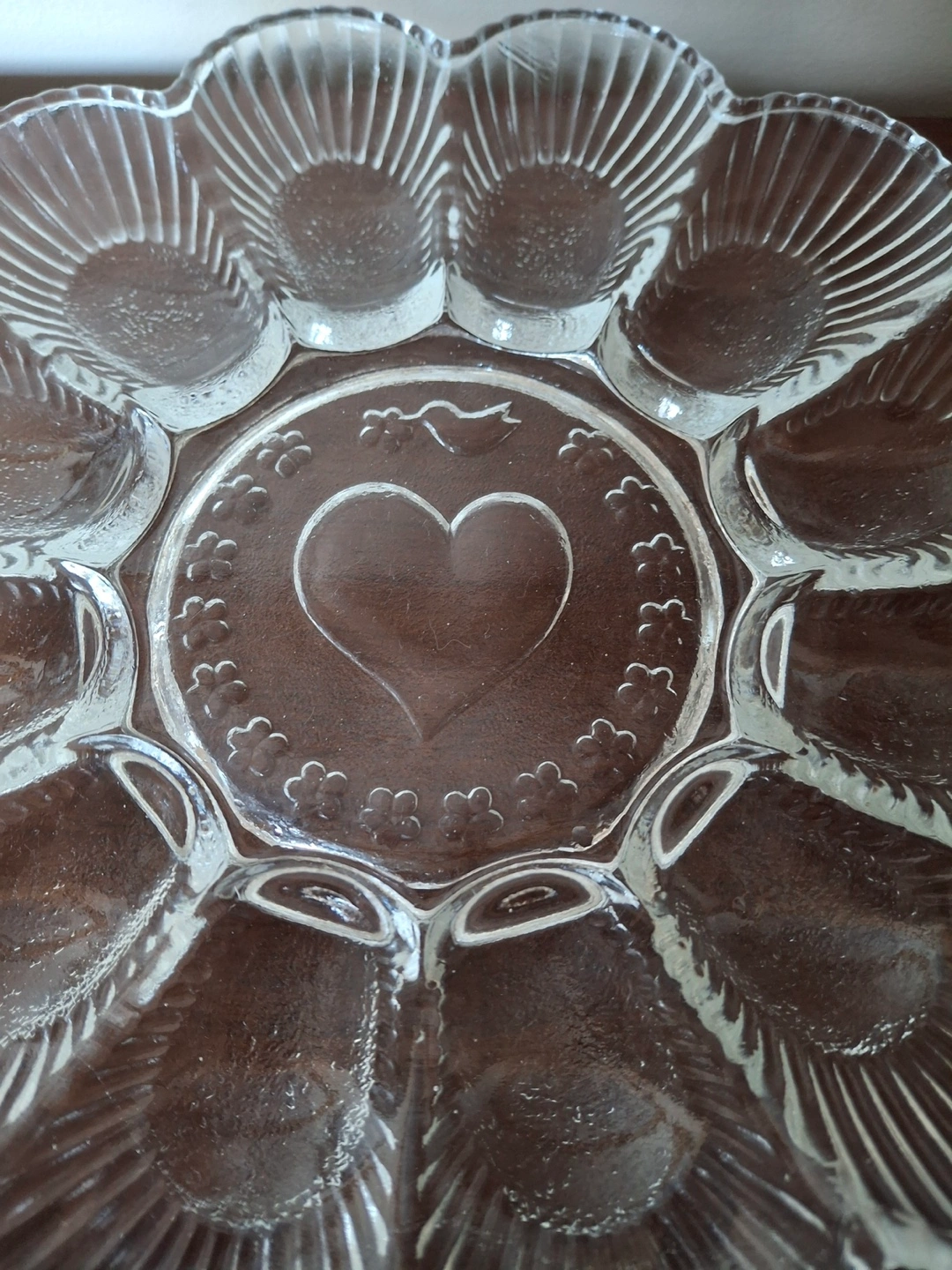 1000+Clear glass egg plate. Twelve sections. Etched heart design in centre. Scalloped edges. 9.5” round. Excellent condition. Available for pickup in Markland Wood.