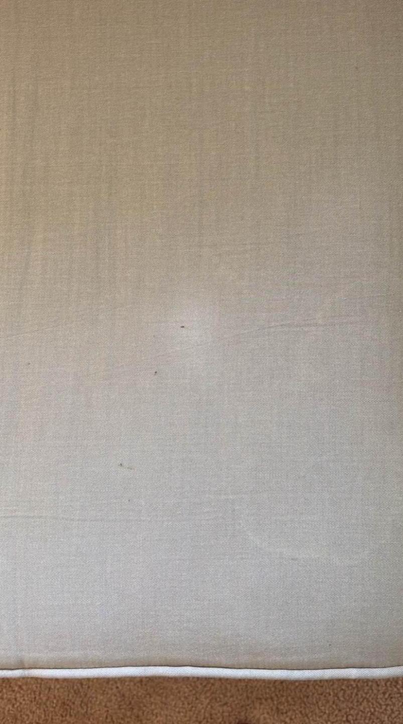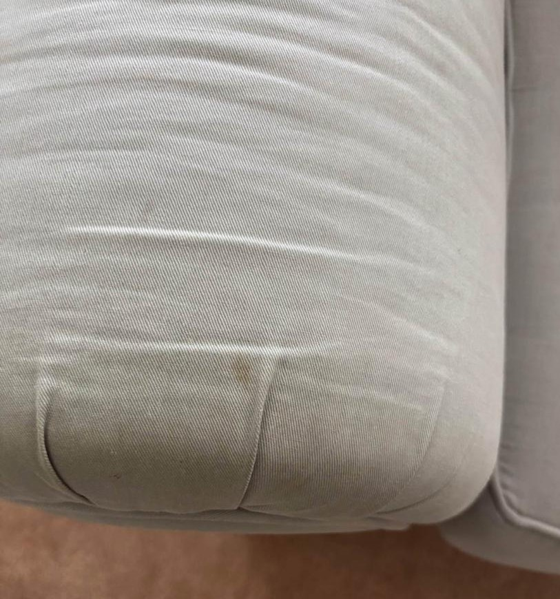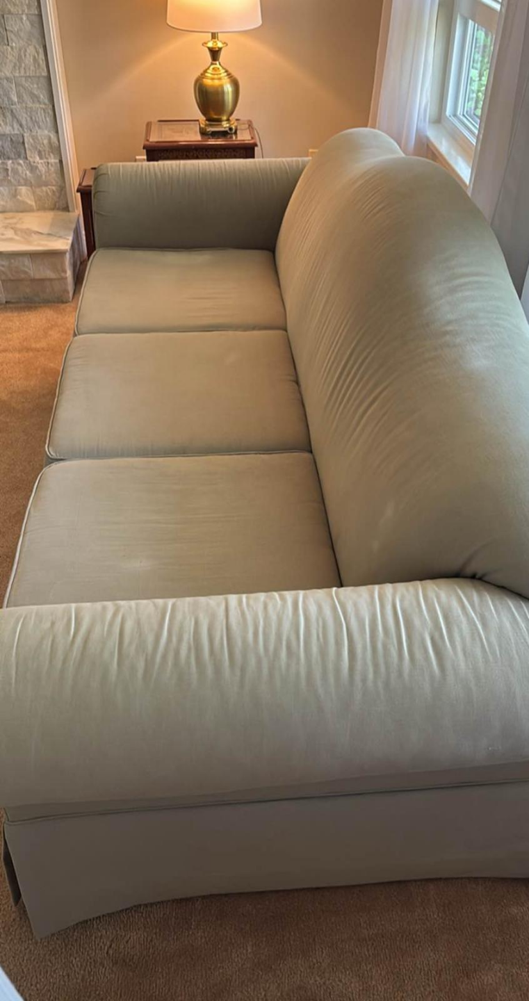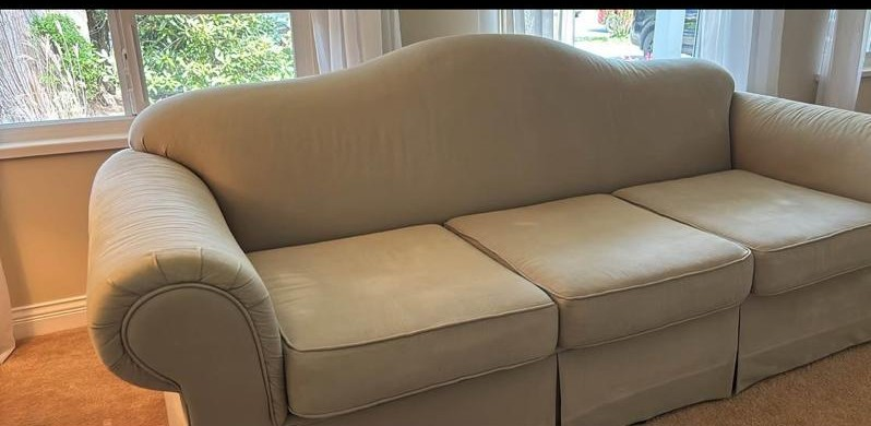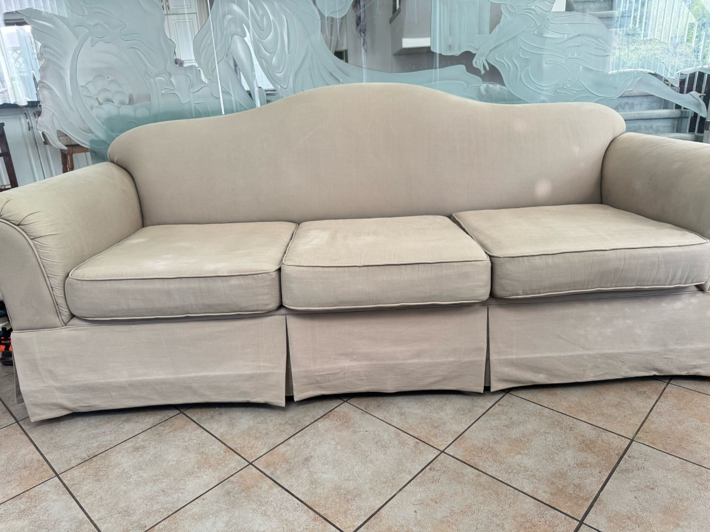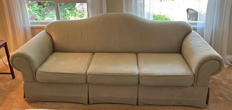 Light beige fabric sofa. Three seat cushions. Rolled arms. Slight curve to the back. Skirt at the base. Shows some minor wear.