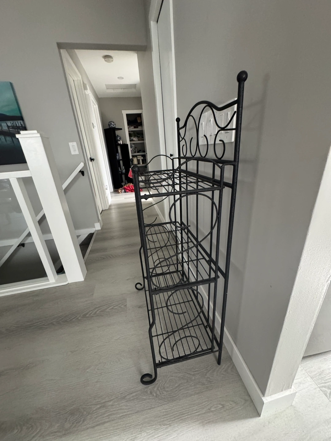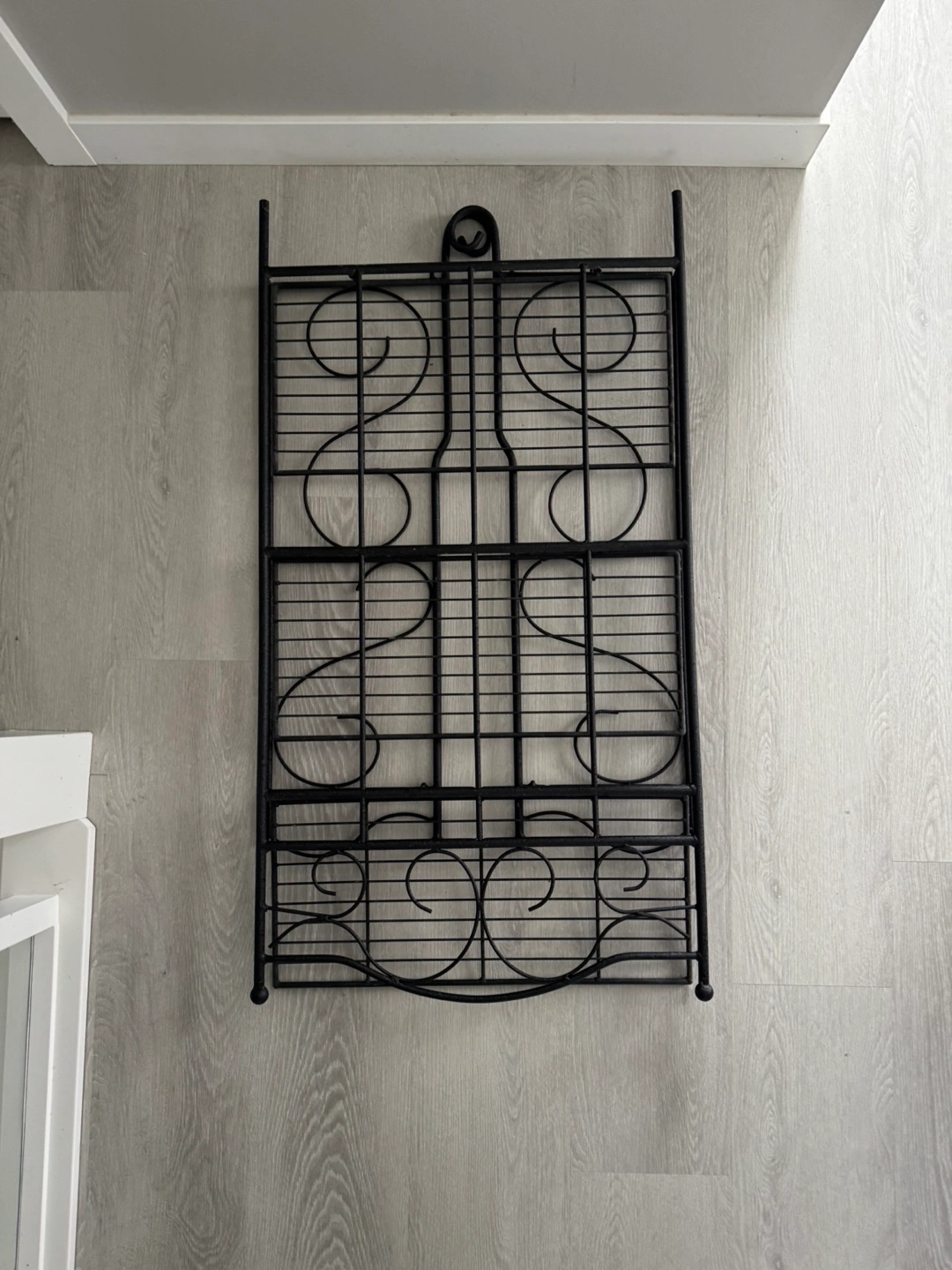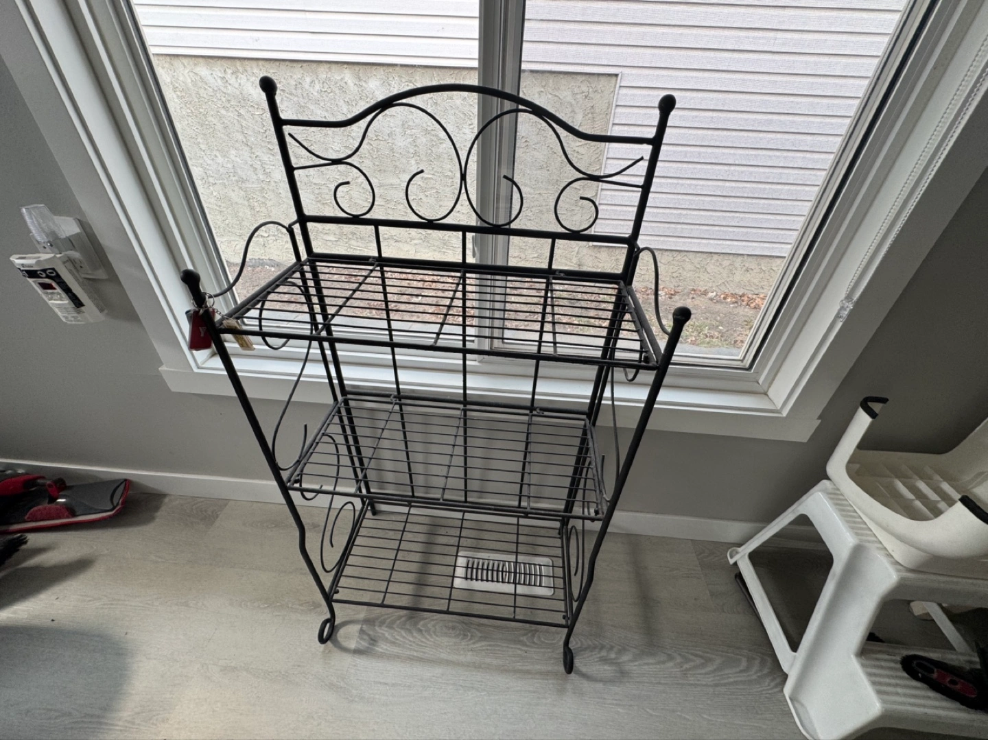 Ornate black metal shelf. Three tiers. Can be wall mounted or freestanding. Elegant design, great for kitchen, pantry, or bathroom.
