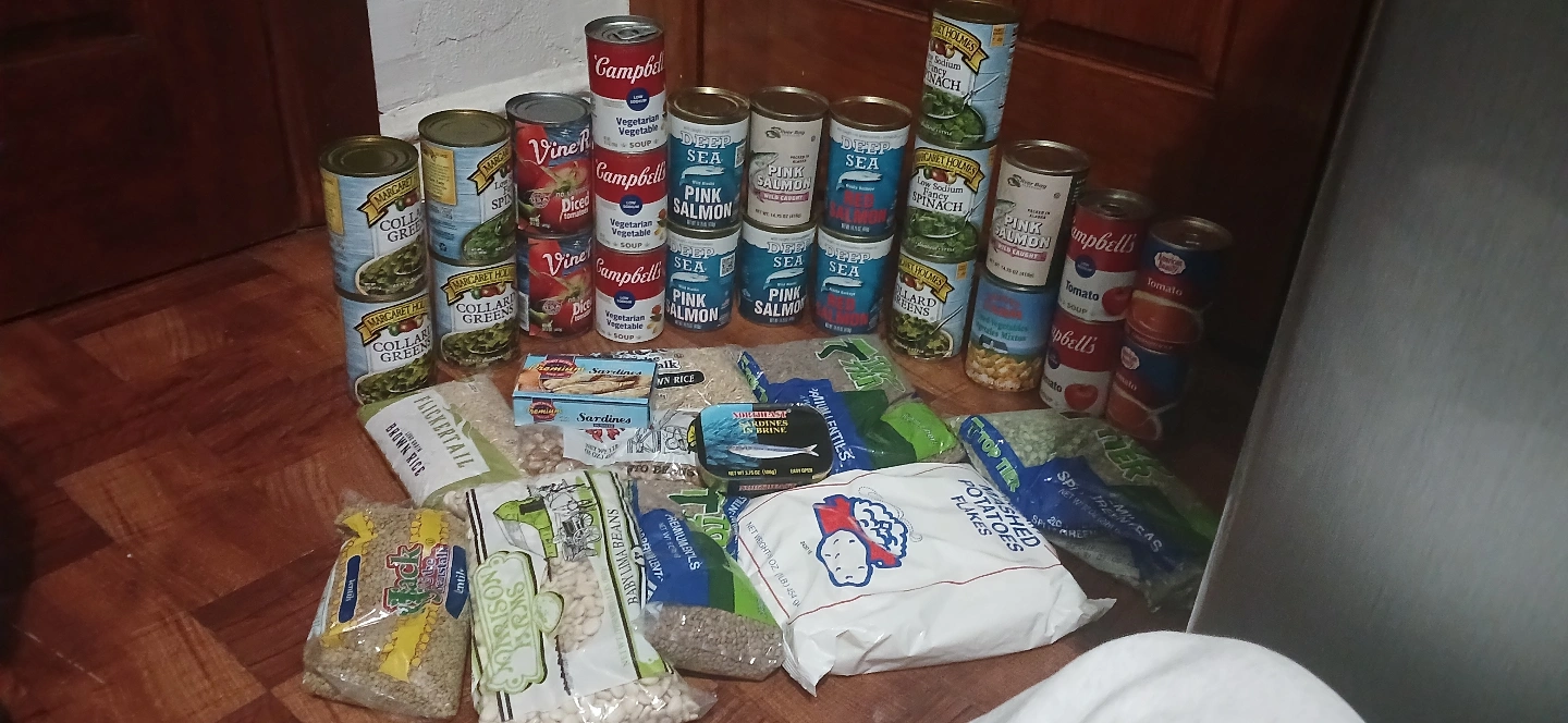Assorted canned goods and rice. Variety pack includes salmon, tomatoes, vegetables, and sardines. Great for prepping or emergencies. Bulk sale.