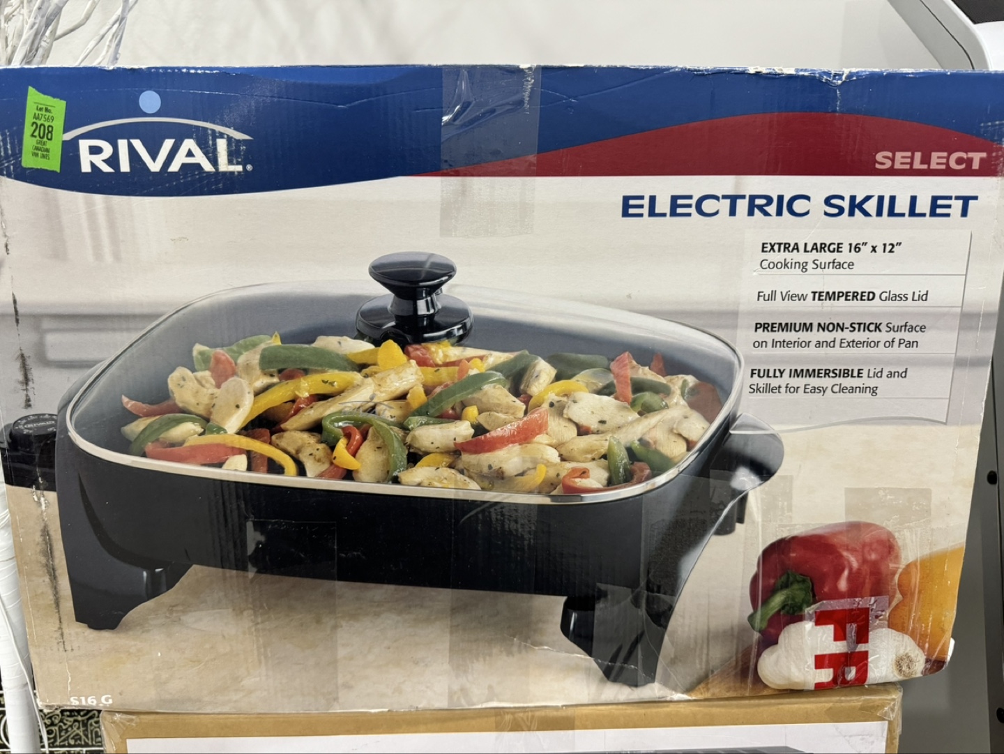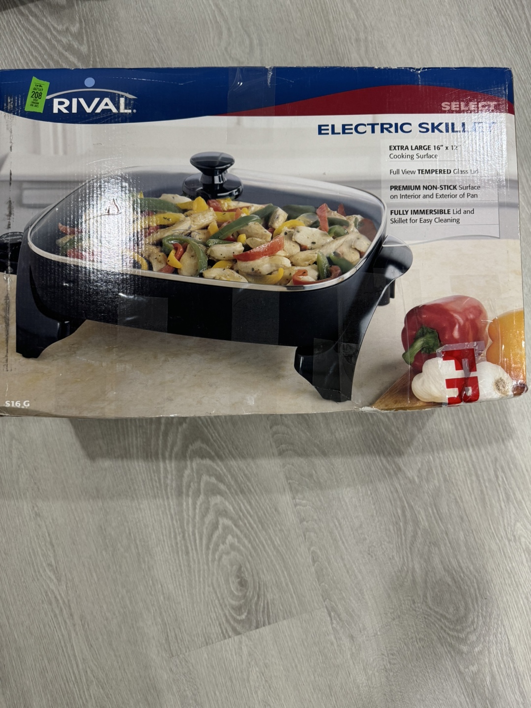 Brand new Rival Select electric skillet. Large 16" x 12" cooking surface. Premium non-stick surface. Full view tempered glass lid. Fully immersible for easy cleaning.
