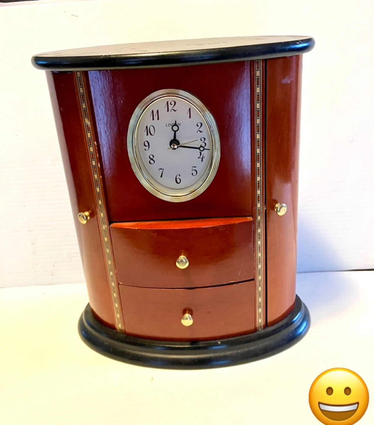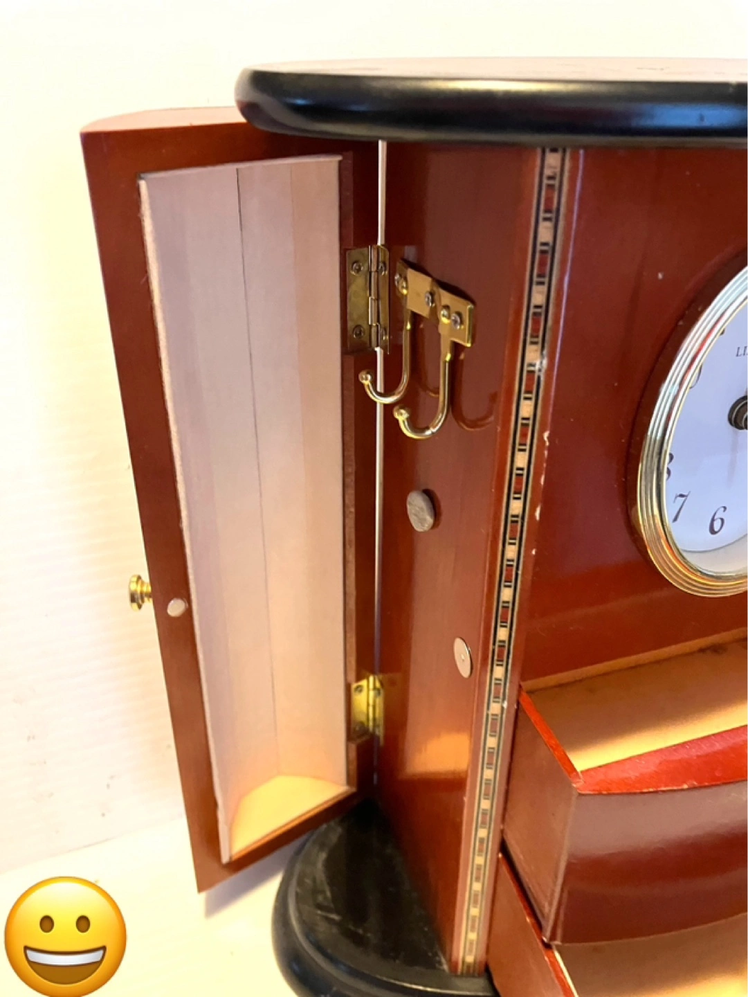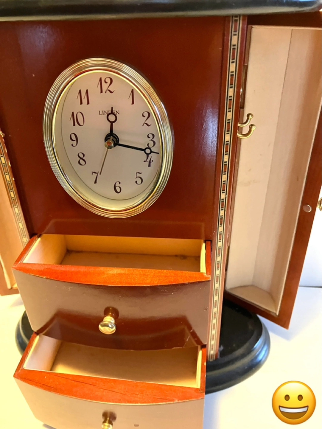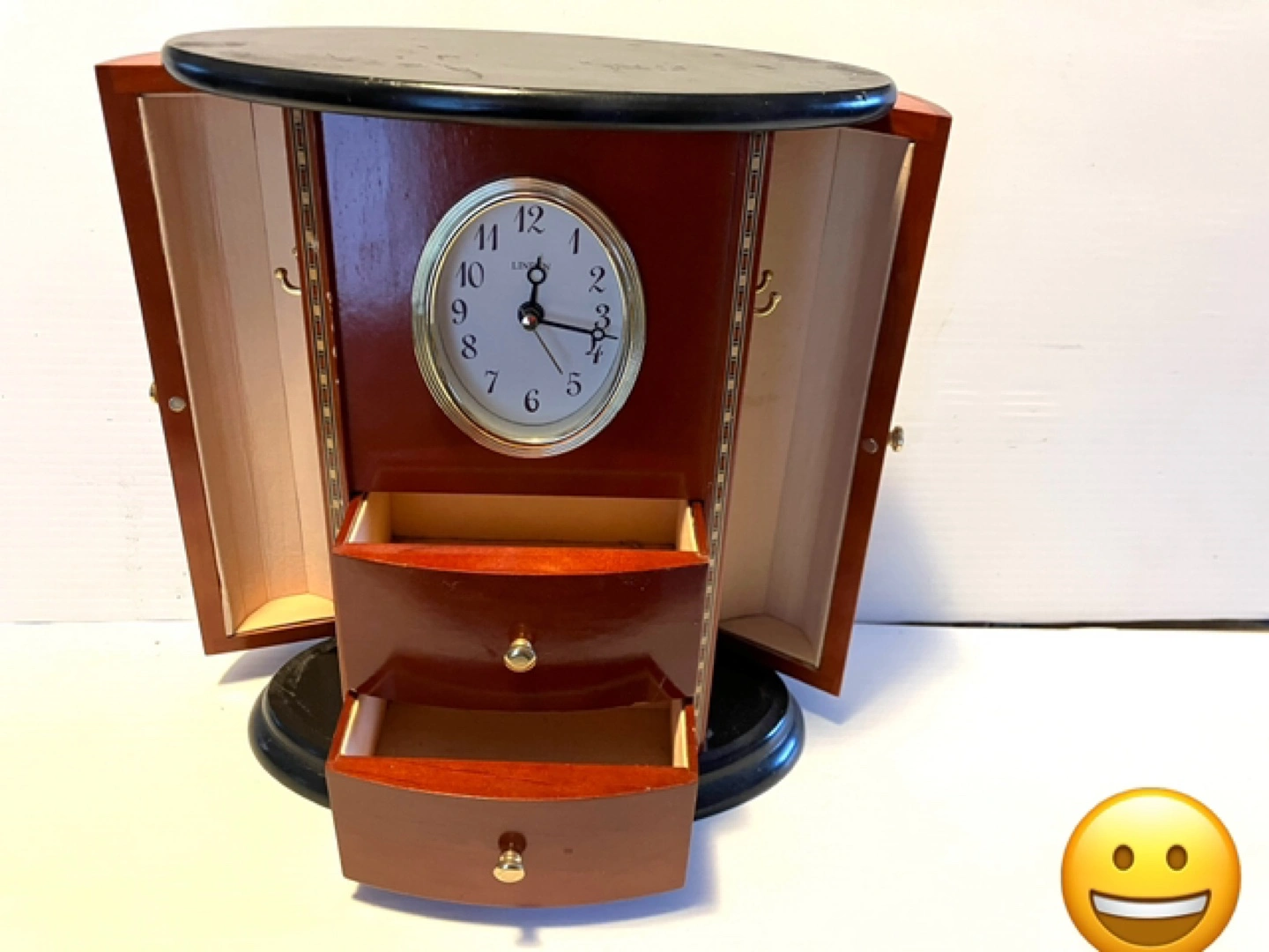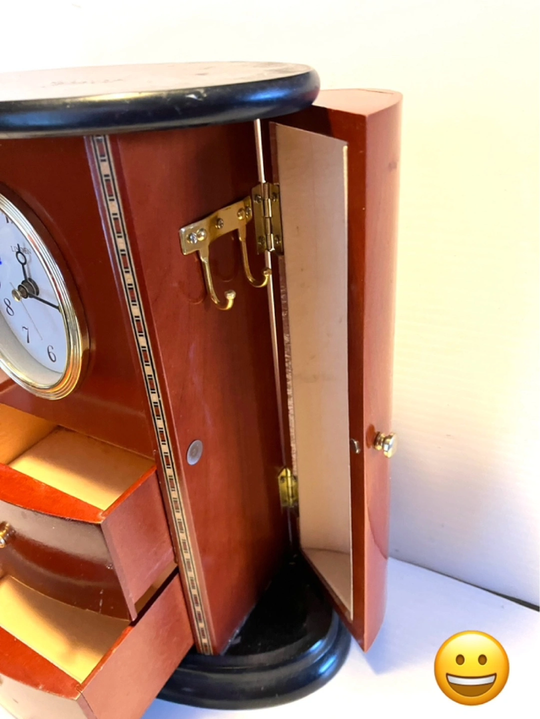 Unique wooden jewellery box. Features two drawers and a hinged compartment. Includes a built-in clock. Excellent for storing jewellery and other small items.