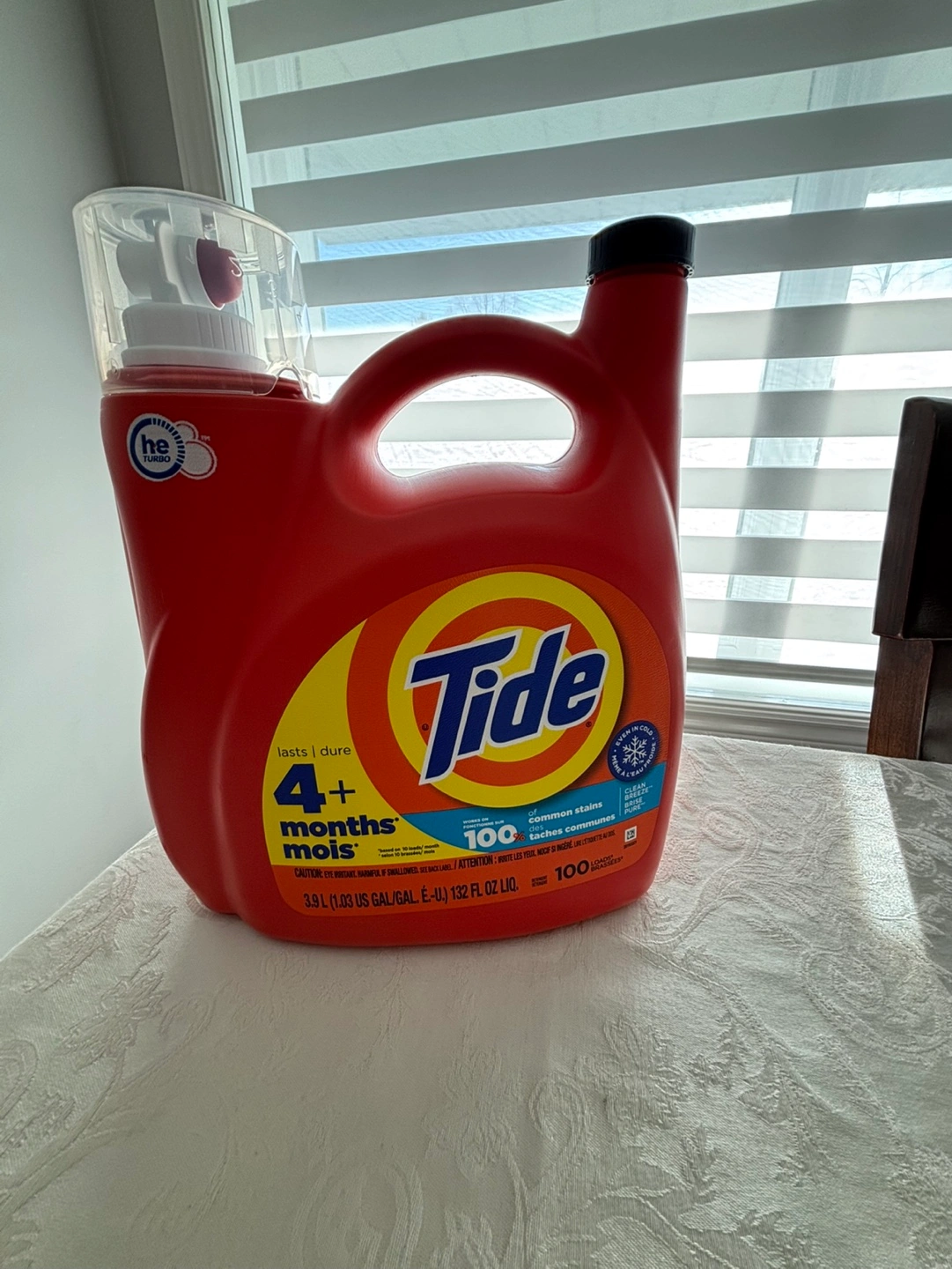 Large bottle of Tide HE Turbo laundry detergent. 100 loads. Clean Breeze scent. Includes a dispenser top. Works in cold water.