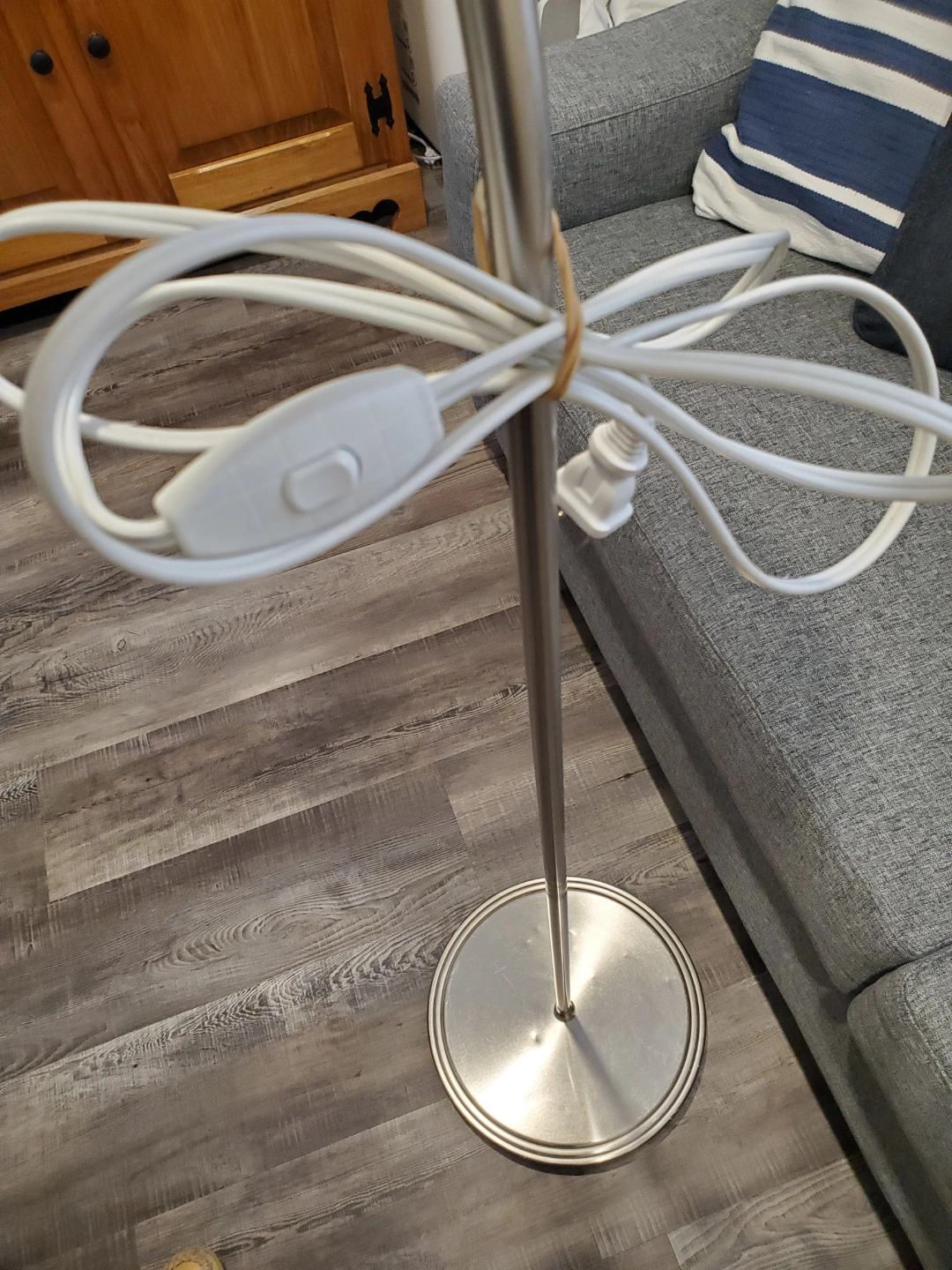 A great Ikea floor light to light up any space. 53" tall and 14" at it widest part near the shade. The shade is made of glass. The shade is moveable up and down, not left to right. No chips. The weighted base is made of metal. It has a nickel metal finish. I accept cash only.