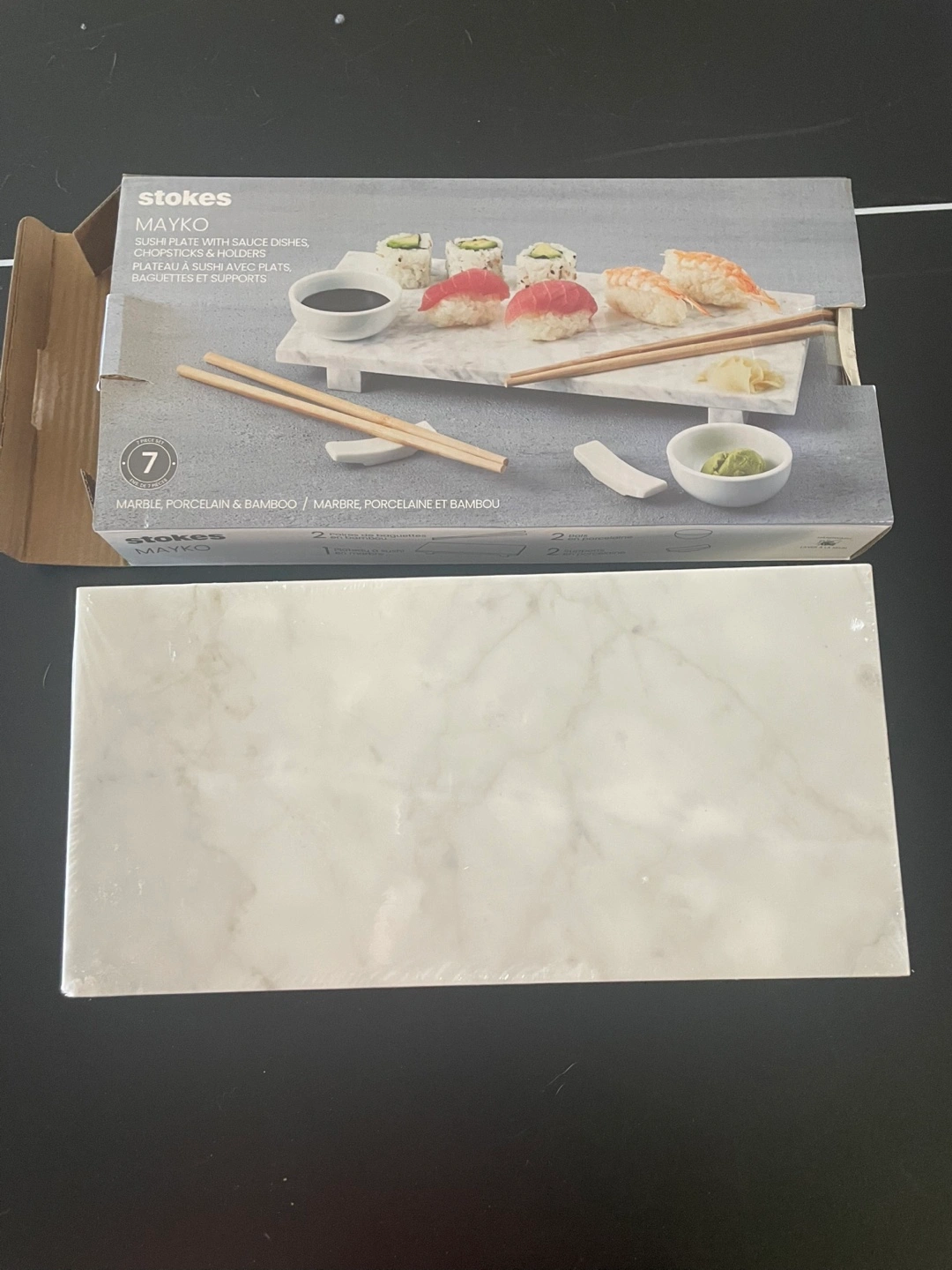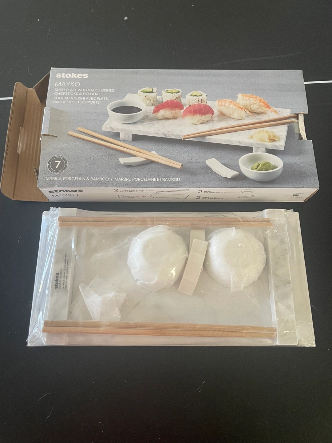 New in box. Marble and bamboo sushi serving set. Includes platter, two small bowls, chopsticks and soy sauce dish. Elegant design, perfect for sushi presentation.