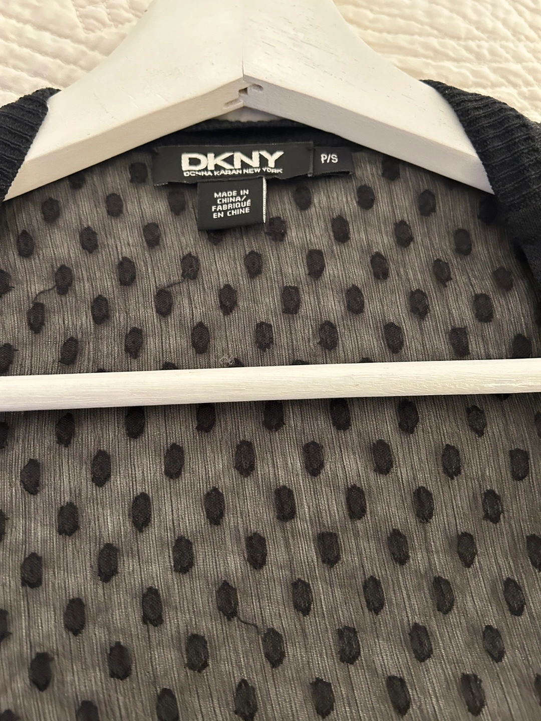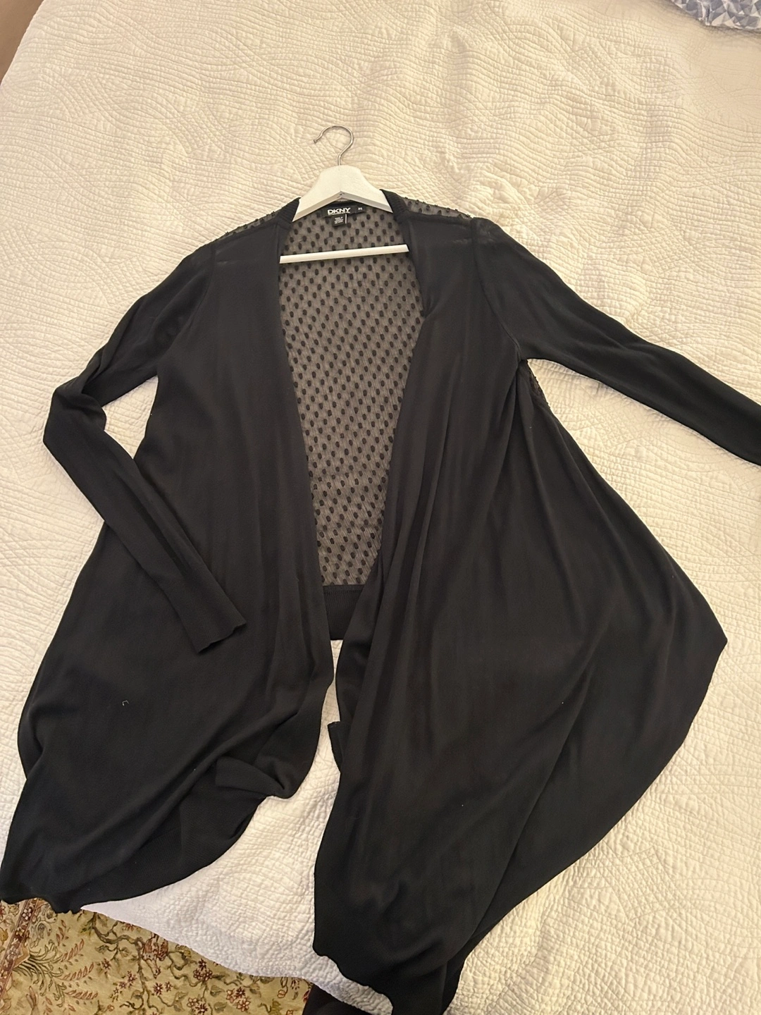 Black long-sleeve cardigan. Features open longer front and sheer polka dot back panel. Size says Small but fits medium! Wool blend.