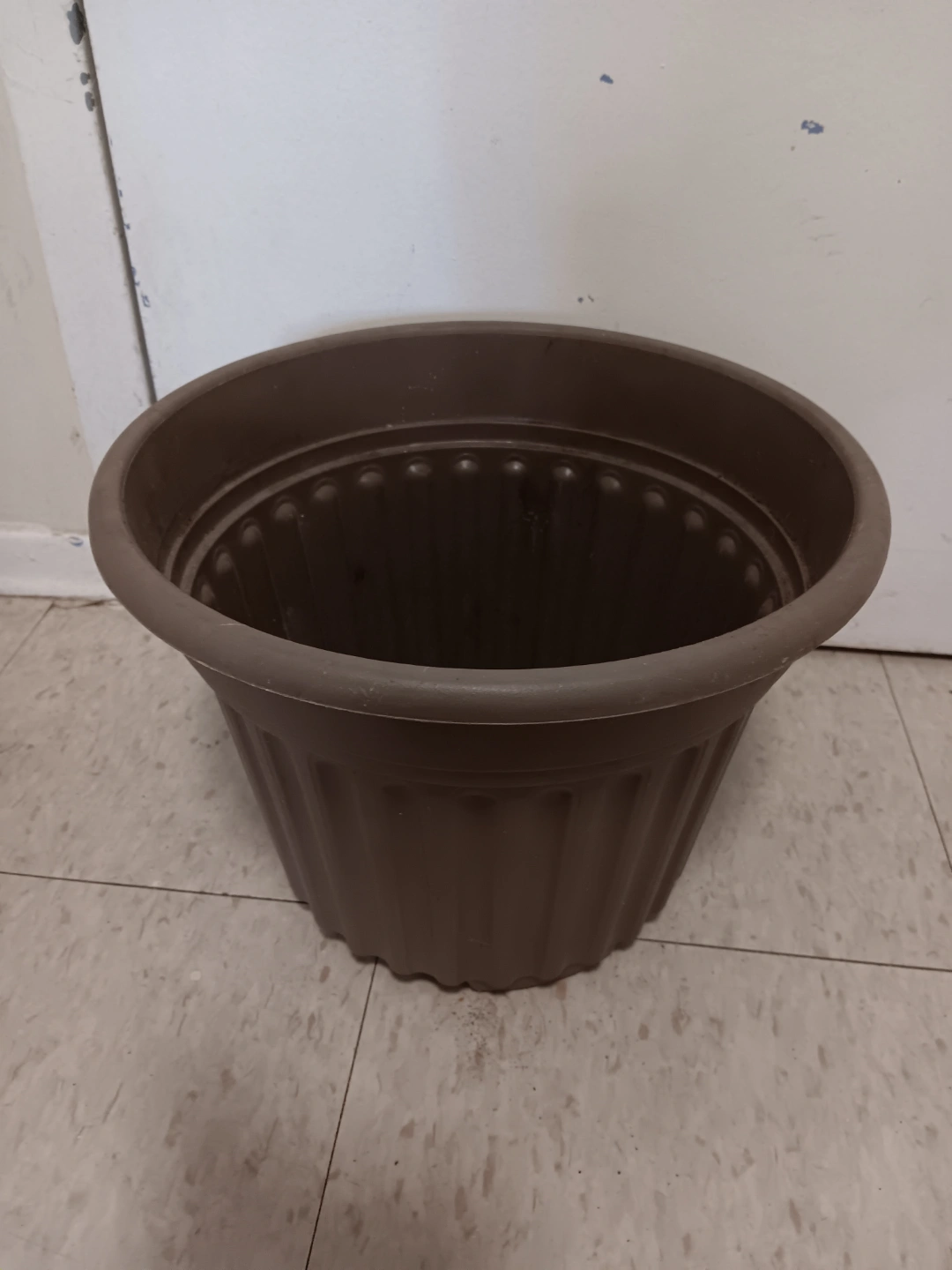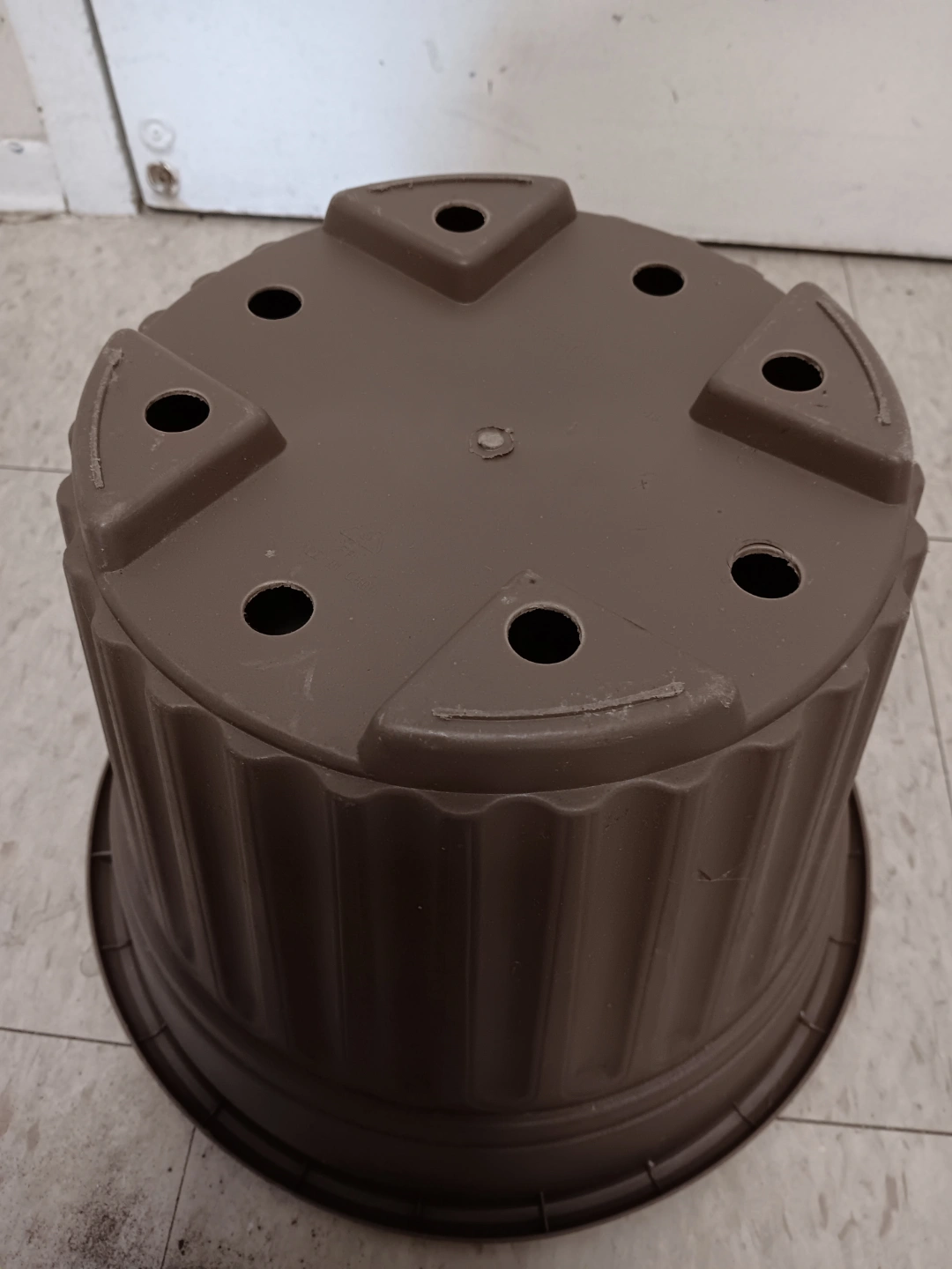 Large plastic planter. Brown colour. Drainage holes in the bottom. Good for indoor or outdoor plants.