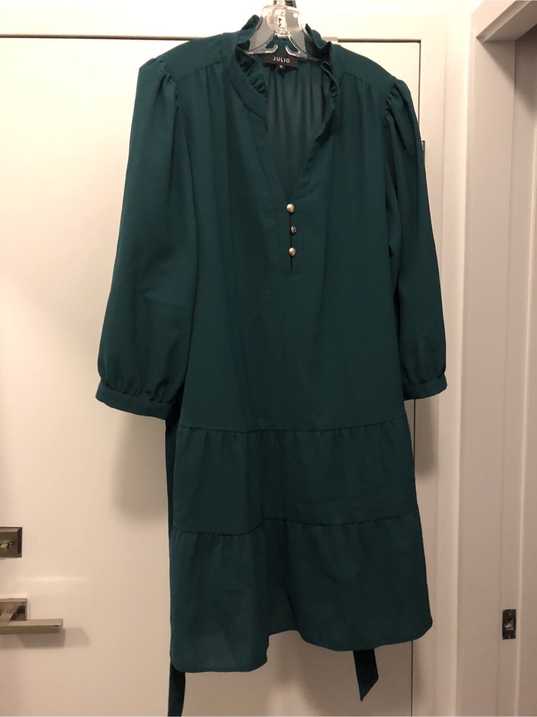 Flowy mini dress. Three quarter sleeves. Tiered bottom. Button front. Size M. Emerald green colour.