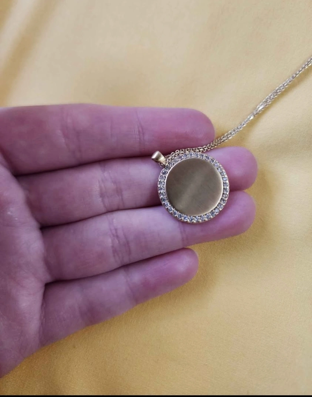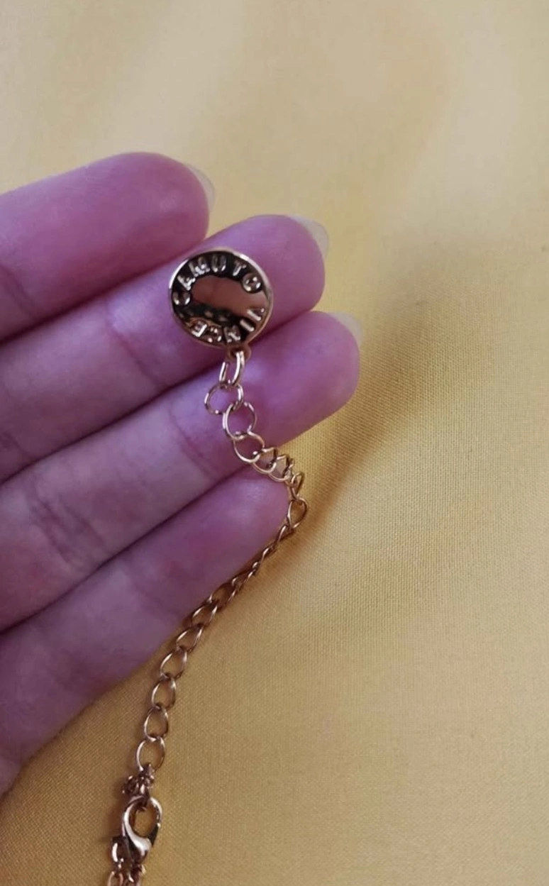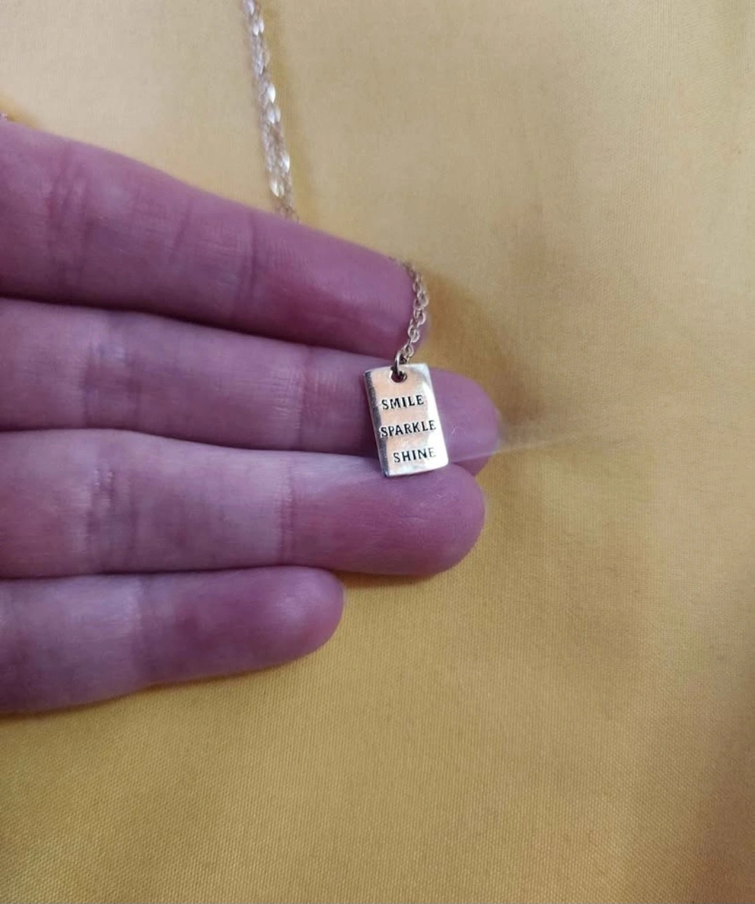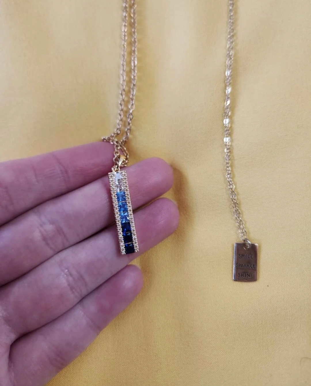 Bundle of three necklaces. One features a blank circular pendant with crystal accents. Another has a vertical bar adorned with blue crystals. The third is a small rectangular tag with the words 'Smile Sparkle Shine'.