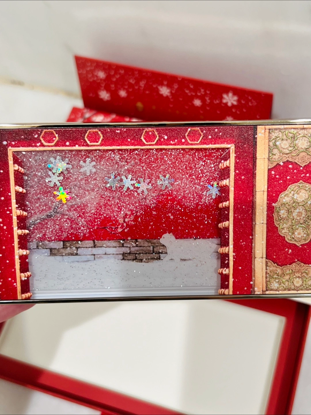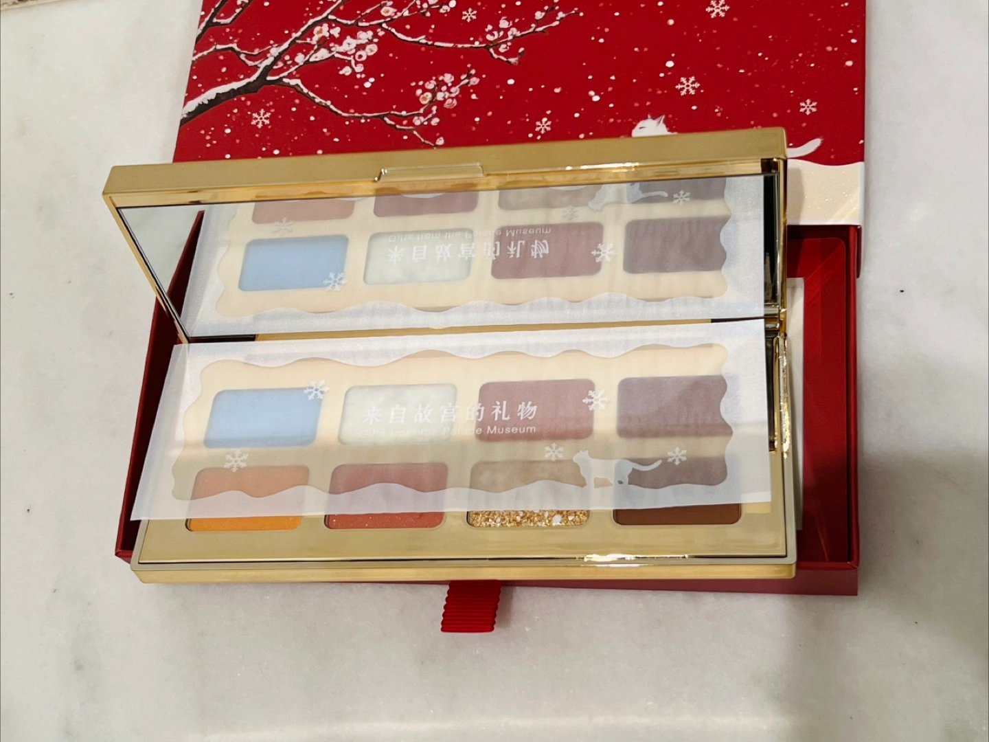 Beautiful eyeshadow palette. Eight shades. Gold accents. Comes in a box with winter scene. Brand new with protective sheet, never used.