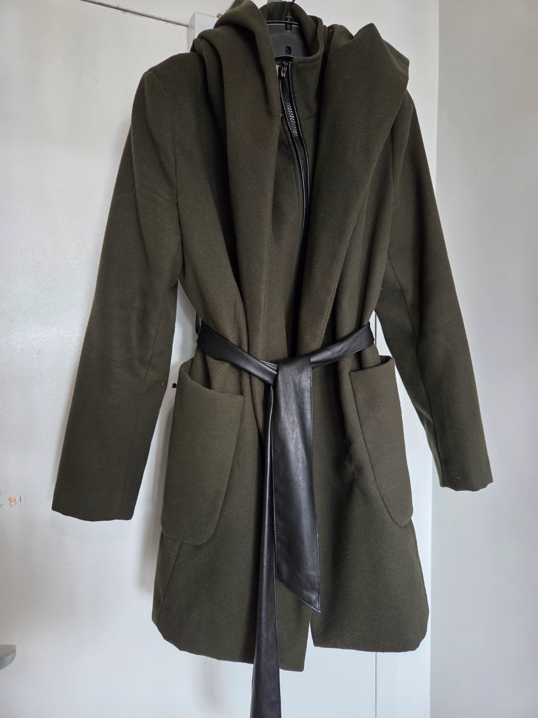 Warm olive green hooded coat. Features a self-tie belt, zipper closure, and pockets. Relaxed fit. Perfect for fall and winter.
