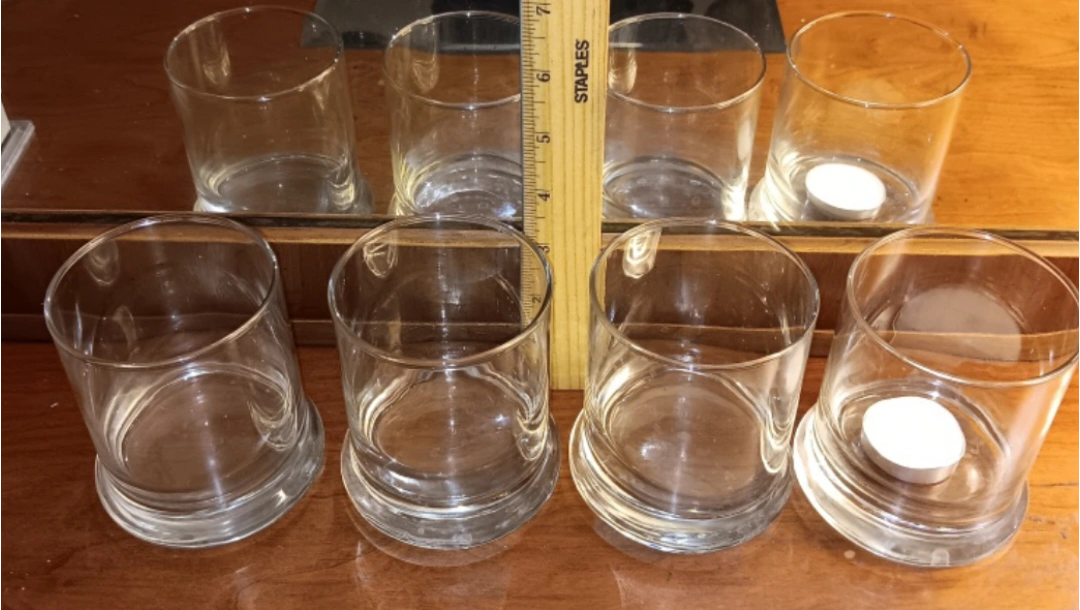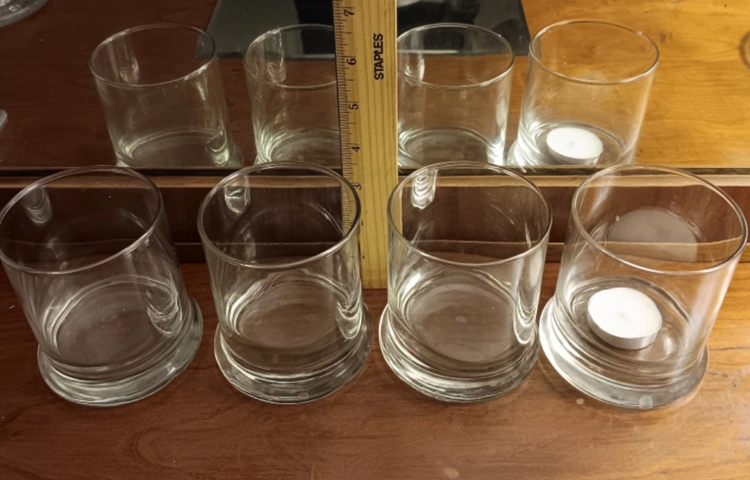 Four clear glass candle holders. 4inches high. Perfect for votive candles or tea lights. Small, cylindrical design. Clean and simple style. Heavy Duty, no scratches like new.