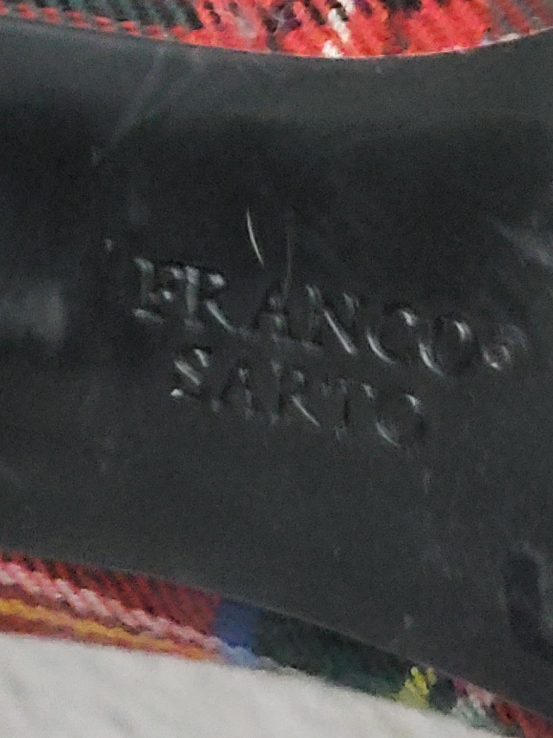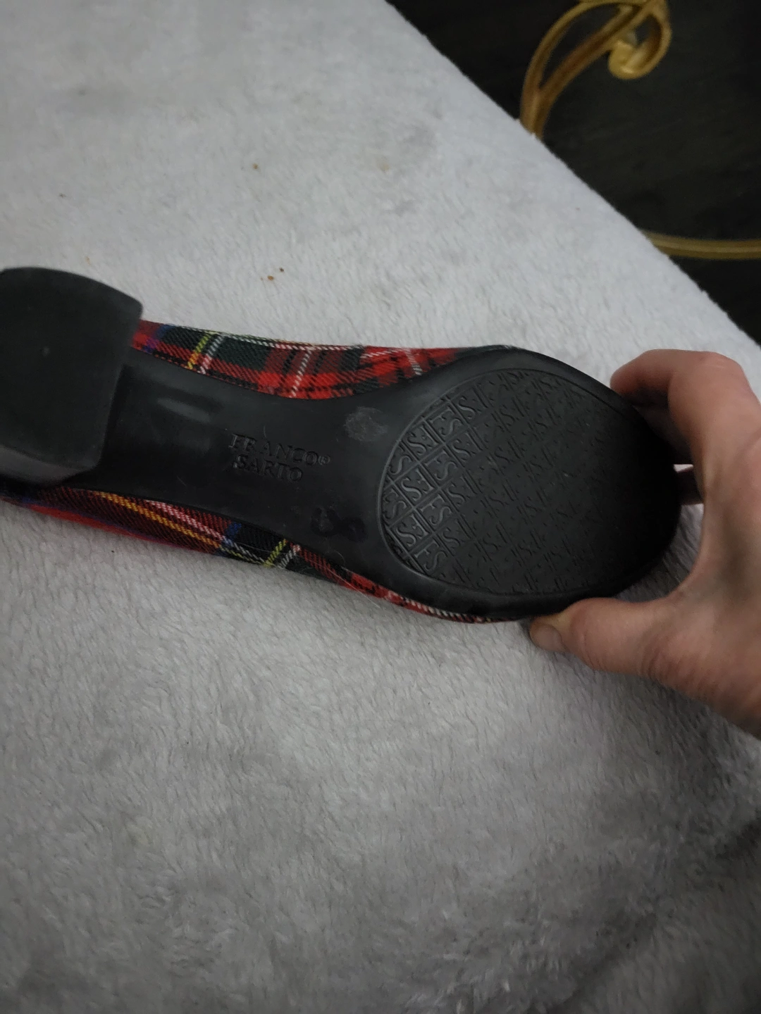 NEVER WORN - Women's Franco Sarto heels. Red plaid fabric upper with black patent leather toe cap, heel and trim. Block heel for stability.