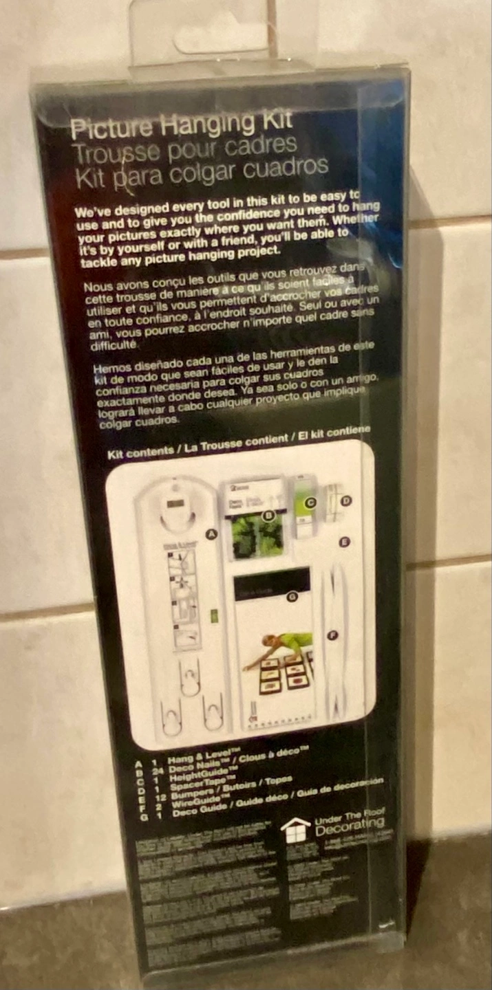 New picture hanging kit. Includes everything you need to hang your pictures easily. Level, nails, wire, and more. Easy to use. Great for all your picture framing needs.
