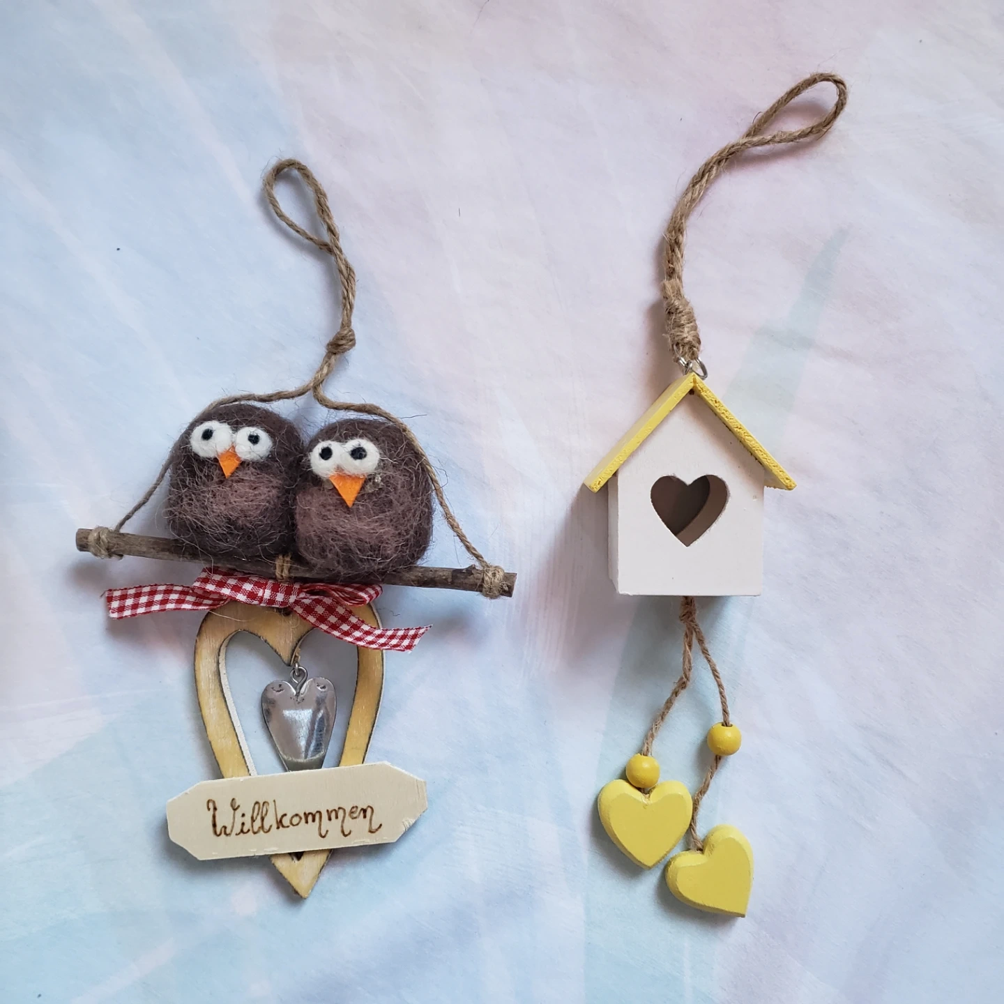 Set of two charming handmade ornaments featuring felt owls perched on a branch and a cute little birdhouse with hanging yellow hearts