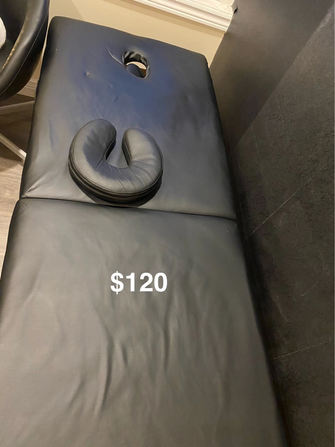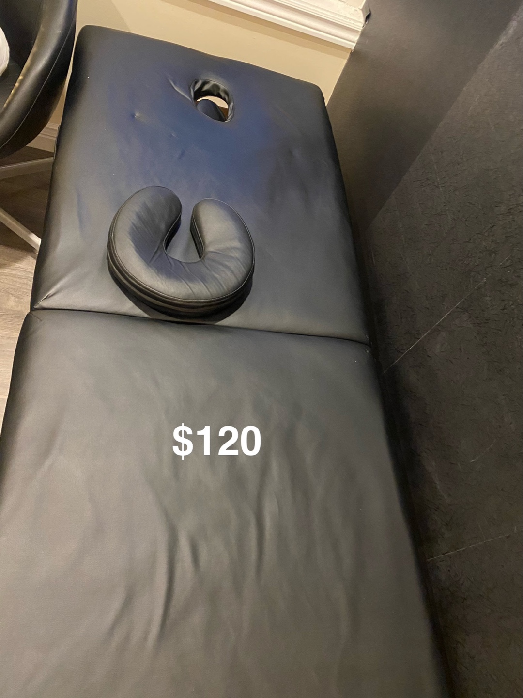 Portable massage or lash table. Two sections. Includes face cradle and armrest. Black vinyl. Excellent condition.