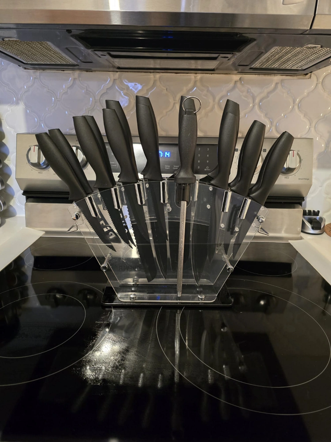 Homever 12-Piece Knife Set with Block Black knife set, twelve pieces. Includes various blades and a clear acrylic block. Great for everyday use.