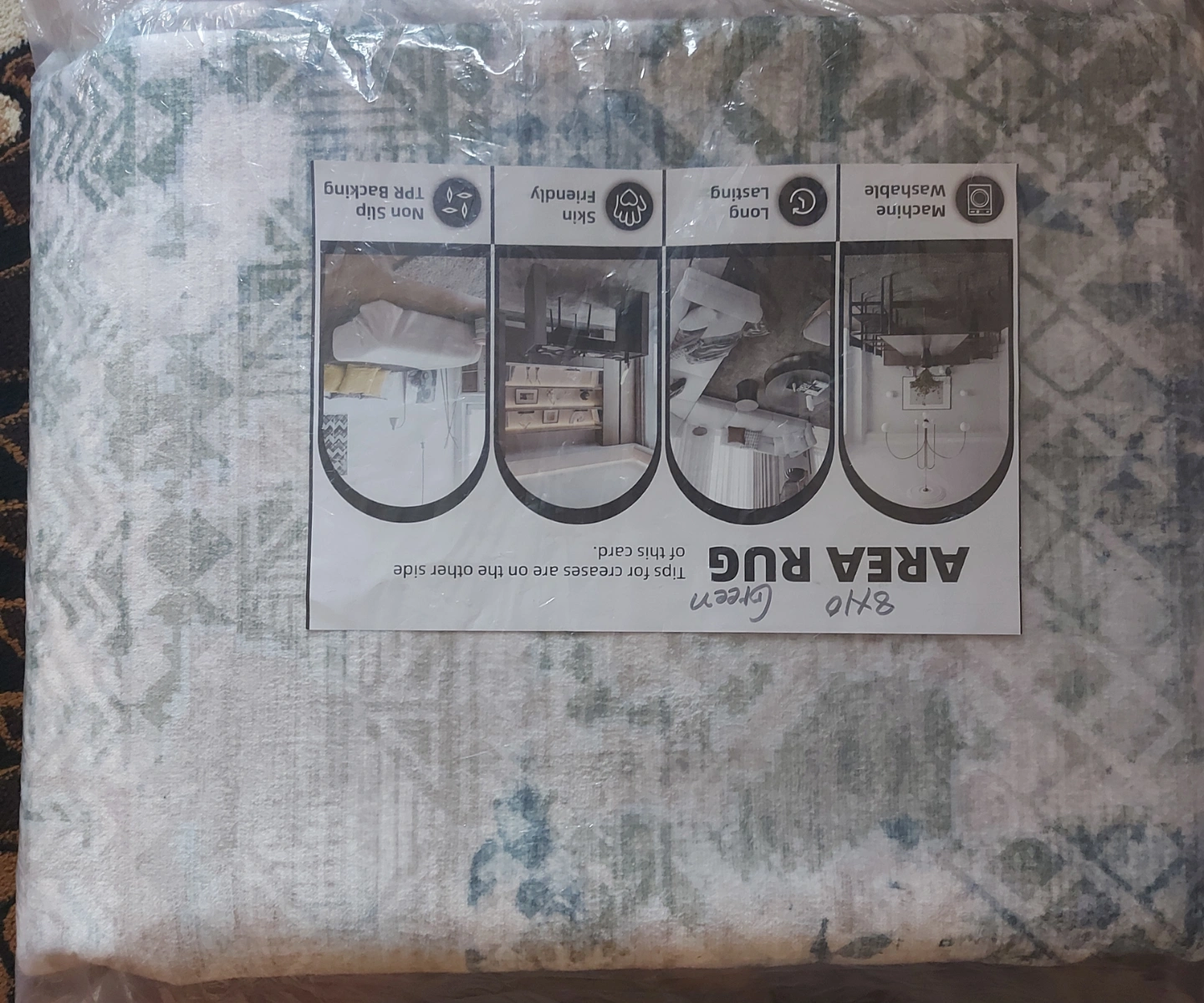 Beautiful 8x10 area rug. Green colour. Machine washable. Non-slip backing. Features a lovely pattern.