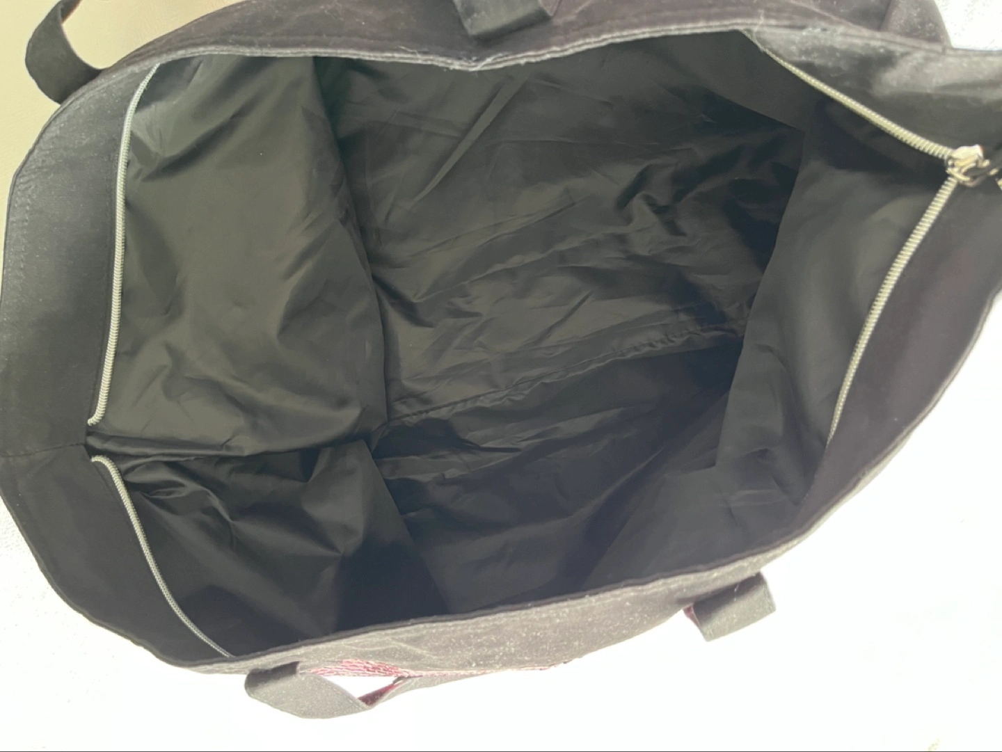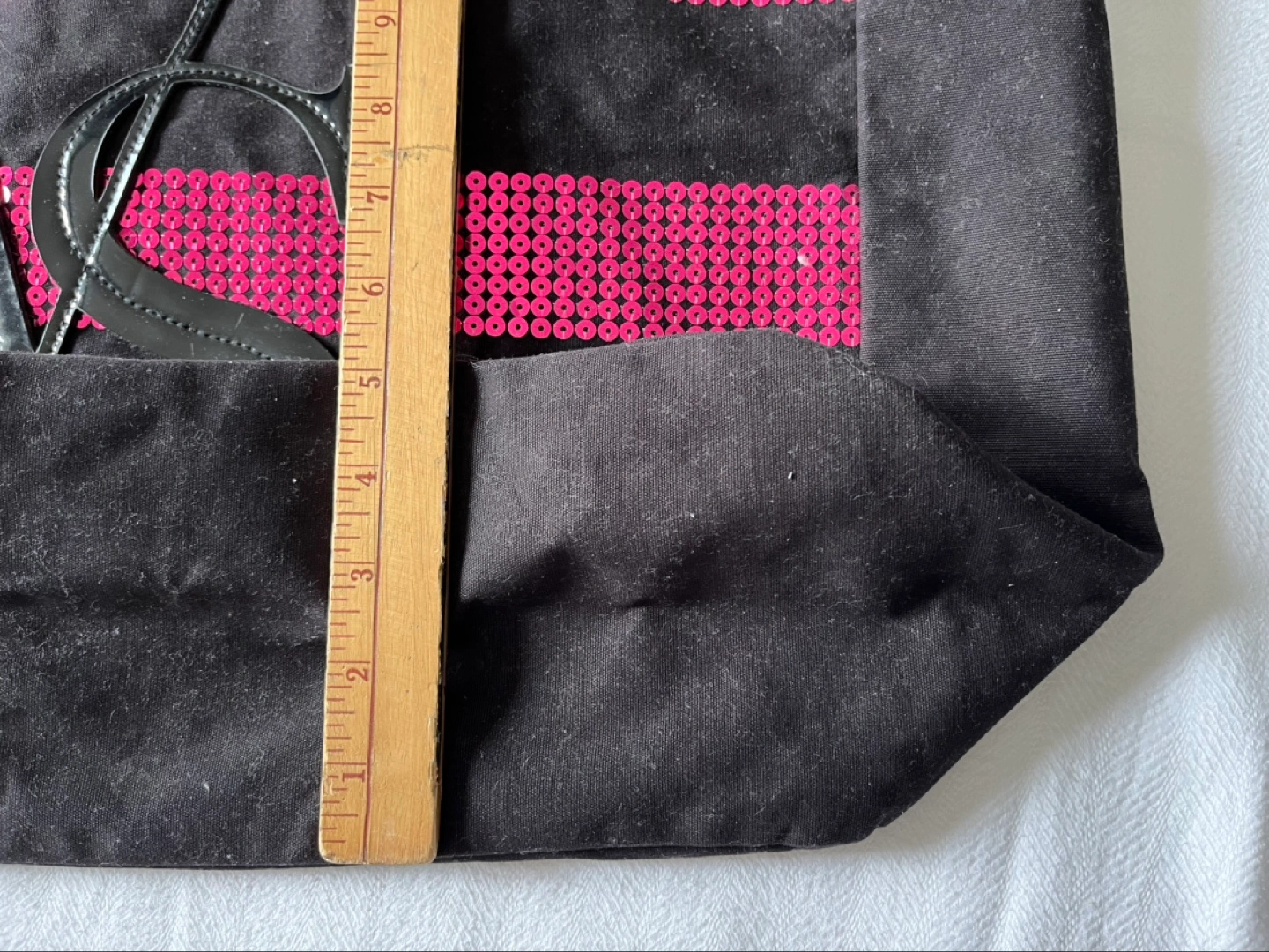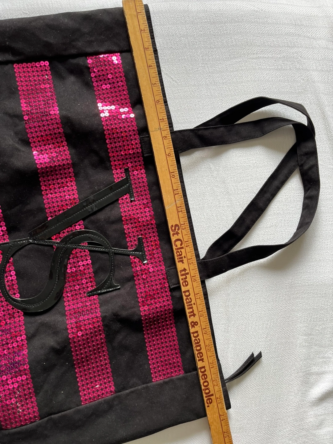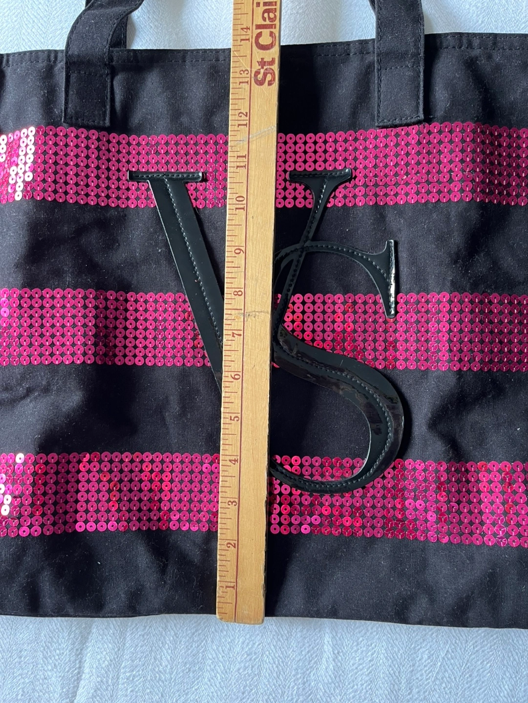 Large black canvas tote bag. Features pink sequin stripes and Victoria's Secret logo. Zipper closure. Great for shopping or travel.