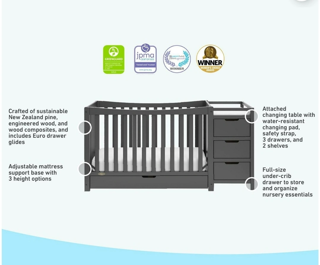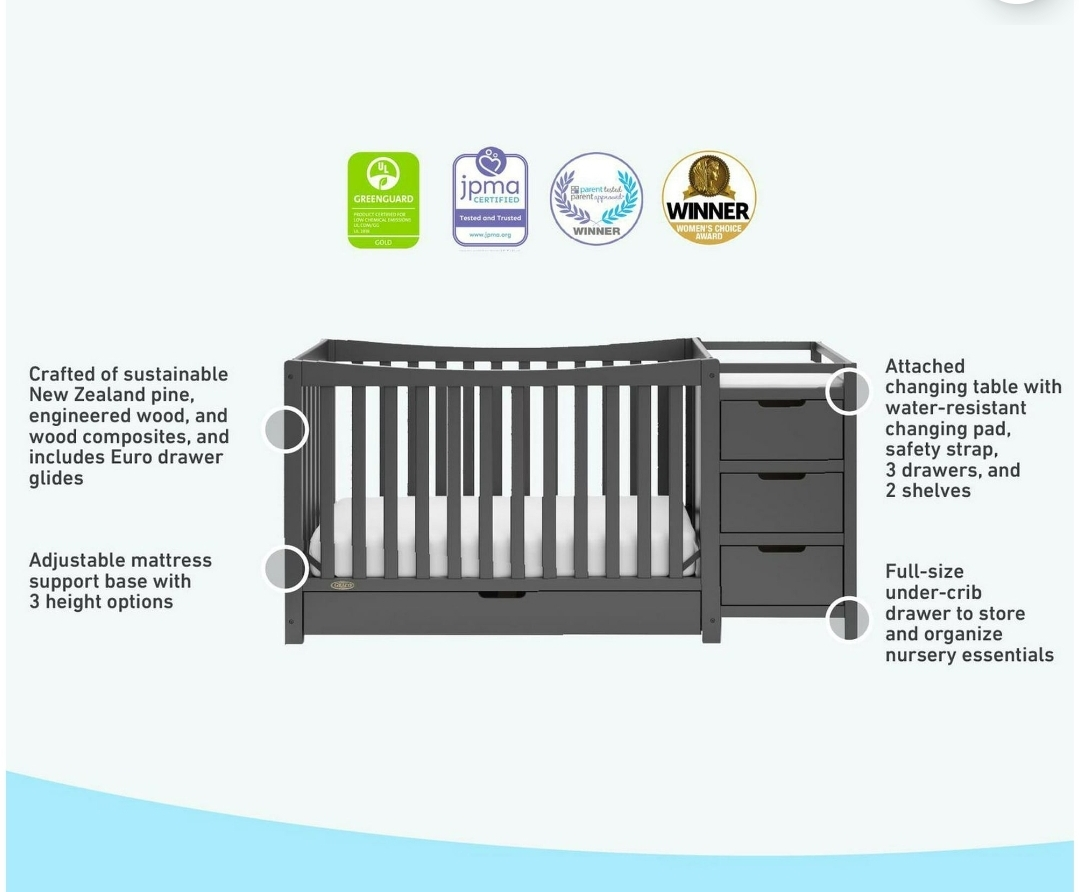 Brand new in box. Converts from crib to toddler bed, daybed, and full-size bed. Features three drawers and a changing table. Includes Euro drawer glides. Crafted from sustainable New Zealand pine, engineered wood, and wood composites.