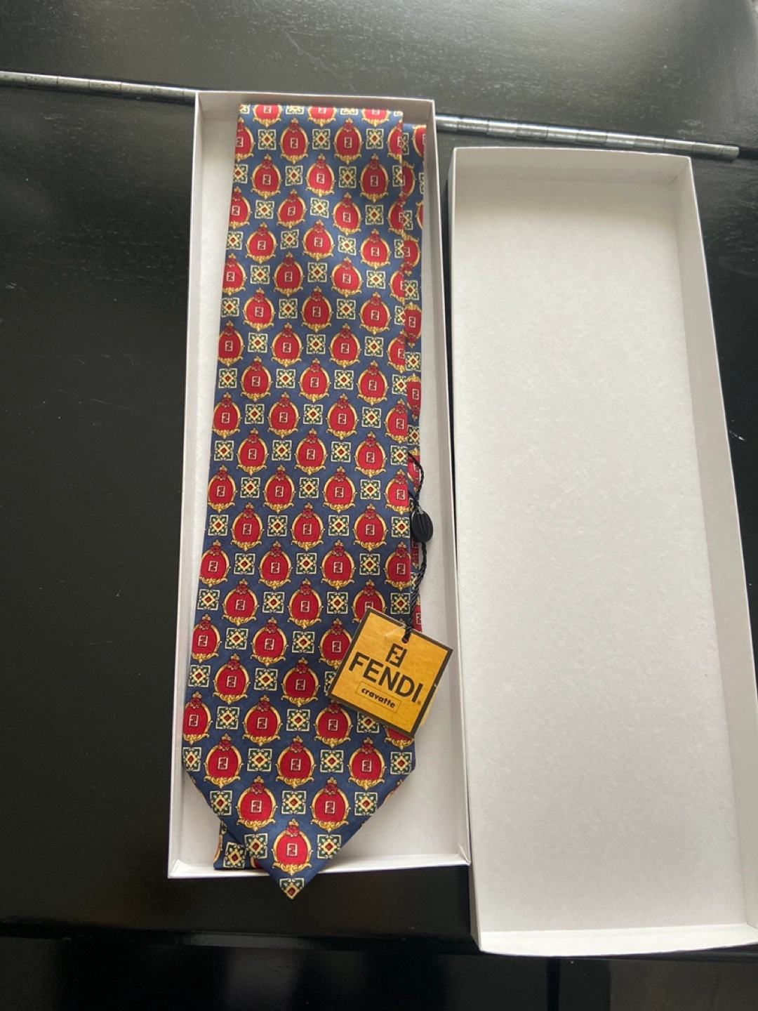 20Men's Fendi silk tie. Navy blue with repeating red and gold Fendi logo pattern. New, never worn. Perfect gift.