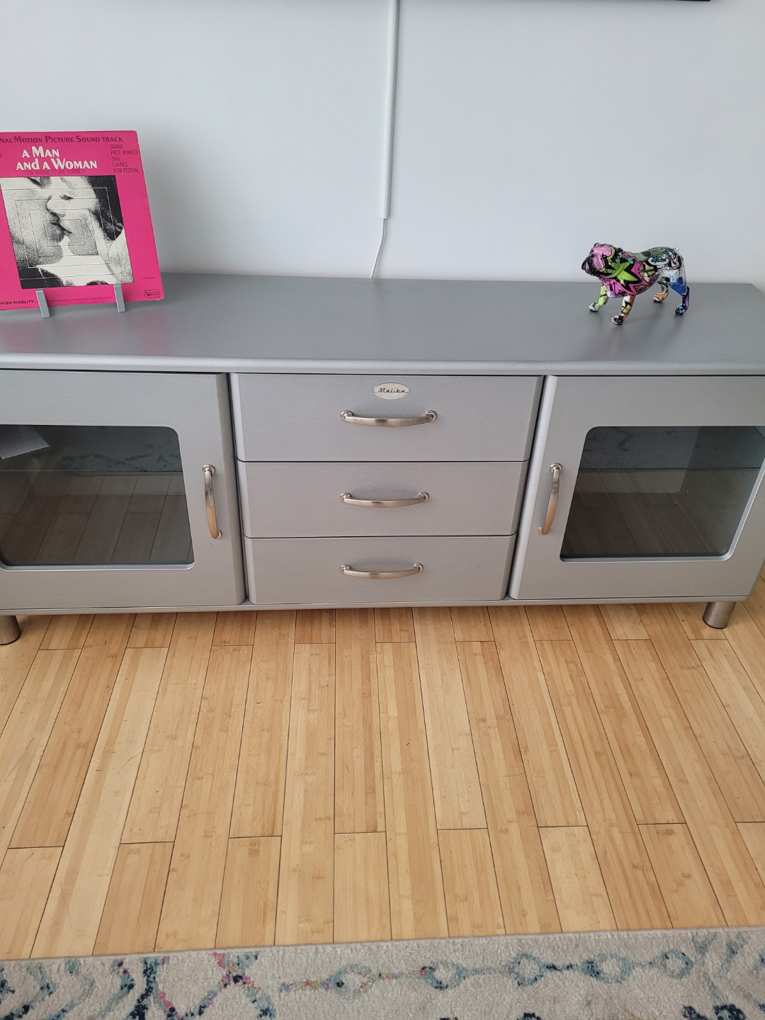 Silver painted media console. Three drawers and two glass doors. Metal handles. Excellent condition. Stylish and functional.