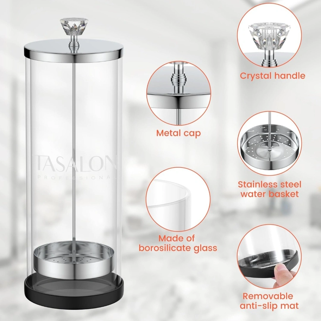 Borosilicate glass jar. Stainless steel water basket. Crystal handle. Removable anti-slip mat. Metal cap. Great for salon or home use. Holds various hair tools.